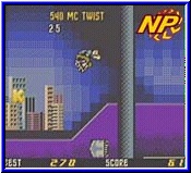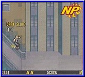 Das ganze hat später auch seine Bedeutung. Hat man sich für seinen Skater entschieden gelangt man zum Board Menu, wobei hier das Thema Geld eine Rolle spielt. Jeder Skater hat natürlich ein Board dabei, das allerdings mittelmäßige Werte hat. Im Verlauf gilt es nun Geld zu verdienen um im Boardshop bessere Boards kaufen zu können. Allerdings sind die Teile weißgott nicht billig. Erst jetzt geht es zum Kursbildschirm, der ebenfalls wie in den großen Versionen angelegt ist. Ihr fahrt nicht hintereinander, sondern könnt aus zunächst 4 möglichen Kursen wählen. Dabei sind die Kurse in THS2 in die Varianten Straße und Half Pipe Kurse eingeteilt. 3 Kurse sind zu Beginn noch nicht anwählbar. Auch hier gilt es Geld zu verdienen um diese freischalten zu können. Wählt man nun einen Kurs an bekommt man den Auftragsbildschirm. Hier wird einem angezeigt was man für bestimmte Geldbeträge tun muß. So z.b. bestimmte Scoregrenzen überschreiten, Dinge einsammeln oder auch das berühmte Wort SKATE einsammeln. In diesem Fall natürlich die Buchstaben. Alles natürlich nach Zeit, wobei man jeden Kurs immer wieder besuchen und nicht alles in einem Stück machen muß, was aber zeitlich auch garnicht drin wäre. Gleichlaufend ungewöhnlich ist dann auch die Vergabe der Paßwörter, die Ihr euch holen könnt wann Ihr wollt. Dabei wird natürlich auch euer Geld und freigeschaltete Kurse und Boards mit berücksichtigt. Also schöne Voraussetzungen für ein motivierendes Spiel. Doch wie sieht’s spielerisch aus? Ganz gut. Vor allem die Half Pipe Kurse haben mir sehr gefallen. Ihr fahrt hier in einer 2D Ansicht nach links oder rechts und habt mehr zur Verfügung als nur eine einzige Half Pipe. Ihr habt Geländer, Hindernisse und kleinere Schanzen um die Moves auszuführen, wobei aber die Half Pipes schon die Bringer sind. Die Move Auswahl ist reichhaltig. Ihr habt 5 verschiedene Grinds, 6 verschiedene Sprungmoves, zwei Lip Tricks und zusätzlich noch für jeden Skater 3 Spezialmoves, so das hier für reichlich Kombinationen und Möglichkeiten gesorgt wurden. In diesem Zusammenhang ein Lob für das Handbuch, das einem vor allem das Zählsystem näherbringt und auch sonst sehr angenehm geschrieben ist. Denn nur mit Kombos kommt man hier überhaupt in Punktbereiche die was bringen. Da die meisten Moves aus Kreuz und A Knopf bestehen sind hintereinander 4 oder 5 möglich. Was auch sein muß. Denn nur so kommt Ihr auf Punkte oder löst Teilaufgaben die auch mal eine 5 Moves Kombo von euch verlangen.