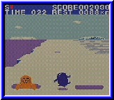 In jedem Level geht es dabei gegen einen anderen Kämpfer Beginnend mit reinem Faustkämpfen geht es weiter mit Waffen und Ketten gegen die es zu bestehen gilt. So werden die Kämpfe im Verlauf immer schwerer. Gleichzeitig läuft ein Highscore mit, der aber wie in allen anderen Spiele durch die fehlende Batterie nicht gesichert wird. Ihr spielt mit 3 Leben zu Beginn und müßt versuchen so weit wie möglich zu kommen. Habt Ihr alle Leben versemmelt ist das Spiel vorbei. Um der Gegner Herr zu werden stehen Lee natürlich einige Moves zur Verfügung. Er kann springen, sich ducken, Deckung nehmen und natürlich austeilen. Jeweils Moves für den Fuß und die Hände stehen zur Verfügung. Allerdings leidet das Spiel durch ein wenig abgehackte Aktionen. Man schlägt oder Tritt - kurze Pause - und weiter gehts. So sind Kombos z.b. fast unmöglich. Auch ist das springen etwas schlecht gelöst. Denn nicht immer macht Lee das was Ihr wollt. Das Spiel ist eher auf die lustige Schiene angelegt, als für ernsthaftes prügeln gedacht. Beide Kämpfer haben jeweils eine Energieleiste zur Verfügung die es gen 0 zu bringen gilt. Wer das zuerst schafft kommt weiter. Das blöde ist das sich im Laufe der Zeit gerade bei den schwereren Gegner die Sache mit der Steuerung negativ bemerkbar macht. Das nervt ein wenig. Grafisch ebenfalls ein Spiel in dem mehr drin war. Aber die meisten der Spiele sind 1:1 übernommen und nie auf den GBC abgestimmt. So auch das letzte Spiel - Antarctic Adventure das mich an meine Kindheit erinnert. Denn das Spielprinzip ist wie als wenn man vor einem Lenkrad sitzt und ein auf einer drehenden Walze fahrendes Fahrzeug steuert. Hier in Form eines kleinen Pinguins, den man auf einer vorgefertigten Strecke nach links oder rechts steuern kann. Die Strecke scrollt selbstständig unter im weg und man muß als Ziel Hindernissen aus dem Weg gehen und innerhalb eines Zeitlimits ein Ziel erreichen. Erwischt er ein Hindernis bleibt er kurz stehen und man verliert Zeit. Dabei sollte man immer wieder Fahnen mitnehmen, die den Highscore nach oben pushen. Kann man über die ersten Hindernisse noch springen, so schauen aus vielen immer wieder kleine Maulwürfe heraus, die ebenfalls den kleinen Pinguin abrupt stoppen. Sehr schön ist das man den Speed der Pinguins durch drücken des Steuerkreuzes nach vorne verändern kann. So fegt man öfters mal über die Strecke und kann bei gutem Durchkommen Bonuspunkte für schnelleres Ankommen einheimsen. Im Endeffekt geht es einmal komplett um den Südpol herum. Verteilt sind dort dann 12 Strecken. Hat man einmal alle Rennen und eine komplette Runde geschafft geht es wieder von vorne los. Allerdings behaltet Ihr eure Punkte, so das die Jagd nach dem Highscore ab jetzt in den Vordergrund rückt. Ebenfalls ein Spiel für die jüngeren. So bleibt trotz der Schwächen des Prügelspiels ein guter Gesamteindruck. Gradius ist gut spielbar und sorgt bei 2D Shootern für Spielspaß. Highlight ist aber wie schon erwähnt Belmonts Revenge, das als einzelnes Spiel durchgehen könnte. Nach wie vor bleibt vor allem das Preis/Leistungsverhältnis ungeschlagen. 4 Spiele zum Preis für 1 sind bei der gebotenen Qualität mehr als angemessen. Einzig das fehlende Speicherfeature stört seit dem 1. Teil. Wenigstens ist diesmal aber zumindest beim umfangreichsten Spiel Belmonts Revenge eine Paßwort Option eingebaut. Das die Serie auch recht gut läuft merkt man auch auf der Rückseite des Spiels, auf der schon die 5er Collection angekündigt wird. Na dann Konami.., an die Pressmaschine.