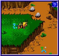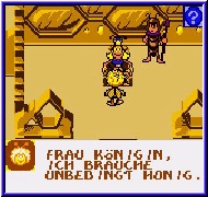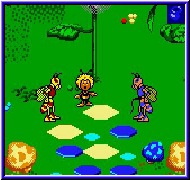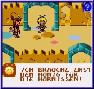 Das Wort schwer ist also für einen normalen GBC Spieler, der vielleicht Zelda DX gespielt hat hier ein Fremdwort. Aber das ist in diesem Spiel nicht so wichtig. Denn für die angepeilte Zielgruppe ist Maja ein kurzweiliges Spiel, das dem Spieler schnelle Erfolge bietet und so nie lange auf die Folter spannt. Bei ihren Unternehmungen lauern auch Gegner, die Maja aber nicht erledigt sondern durch kleine Kugeln nur Bewegungsunfähig macht um so an ihnen vorbeizukommen. Desweiteren kann sie per A- Taste Fliegen, was vor allem im Wasserbereich wichtig ist. Auch dafür existiert eine Anzeige in Form kleiner Blumen. Um fliegen zu können muß die Anzeige zumindest ein wenig gefüllt sein. Nachschub wie auch für die Kugeln sind verteilt in den Teilen der Welt zu finden. Ebenso besitzt sie eine Lebensanzeige, die aus 6 kleinen Teilen einer Bienenwabe besteht. Bei jedem Treffer verliert sie ein Teil. Sind alle 6 einmal weg ist das Spiel beendet und man beginnt von vorn oder per Paßwort. Das ist sehr schön gelöst. Die Paßwörter gibt es immer in gewissen Abständen oder nach wichtigen Ereignissen, so das man nie lange spielen muß sollte man wirklich mal ein Leben verloren haben