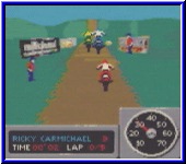 daneben die Zeit. Mit Select kann man im Rennen die Zeiten gegen eine Streckengrafik tauschen, um die Positionen seiner Verfolger zu beobachten. Die Steuerung ist recht einfach, mit A gibt man Gas, B ist die Bremse (die man nie braucht) und das Kreuz für die Lenkung. Bei Sprüngen sollte man seine Maschine hochziehen um einen großen Satz zu machen. Vergeßt bei der