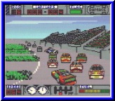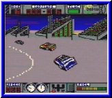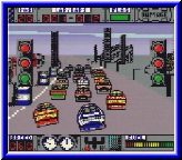 egal, denn das Spiel ist in meinen Augen zu leicht. Wenn man nicht gerade 100% und mit voller Schadensanzeige fährt ist es auch auf Hard kein Problem jedes Rennen zu gewinnen. Das macht es ein wenig langweilig. Einzig der Boxenstopp und die zu überrundeten Fahrer, die man manchmal schon in der dritten Runde trifft bringen Abwechslung. Gerade der Sprit ist ein gutes Feature, da man selbst mit vollem Tank nicht immer durchfahren kann und an die Box muß. Das mußte ich erkennen als ich im ersten Rennen der Meisterschaft mit leerem Tank 2 Runden vor Schluß ausgeschieden bin. Wären die Gegner stärker hätte diese Effekt zur Spannung beigetragen. Aber so kann man selbst 2x die Box besuchen ohne die 1. Position zu verlieren. Hier wäre etwas mehr Feintuning wünschenswert gewesen. Speichern kann man immer nach jedem Rennen auf der internen Batterie, die einen Speicherstand zuläßt. Desweiteren werden auch Rekordzeiten fest gespeichert. Die Ansätze sind eigentlich wirklich gut, werden aber durch die angesprochenen Kritikpunkte wieder neutralisiert. Die Fahraction selber ist durchaus gelungen, wenn man von langsamen Geschwindigkeiten absieht. Ansonsten sind Überholmanöver drin und die Gegner versuche auch bei einer Runde Rückstand euch irgendwie am vorbeikommen zu hindern. Oberhalb und unterhalb des Screens sind reichlich Anzeigen vorhanden. Neben Rundenanzeige, Position, Tacho oder Ganganzeige ist auch eine Flaggenanzeige vorhanden. Schade nur das gerade die gelbe fehlt, die ebenfalls ein wenig Abwechslung bringt. So sind die enthaltenen für die Halbzeit des Rennens, der Beginn der letzten Runde und die Siege Flagge eher Gimmick. Wer Meister geworden ist kann sich auf jeder Strecke auch einzeln beweisen und dort ebenfalls die Options und damit das Rennen seinen Vorlieben anpassen