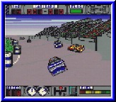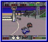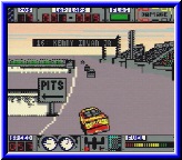 Neben der Anzahl der Gegner in den Rennen, die beachtliche 20 maximal betragen kann, könnt Ihr z.b. die Rennlänge in 1er Schritten einstellen. Dabei bietet Nascar 2000 als erstes die Möglichkeit auf dem GBC knapp 200 Runden zu fahren, was die Rennen bei Rundenzeiten von knapp 40-50 Sekunden durchaus zum Abendfüller machen kann. Desweiteren gilt es eine Schadensanzeige einzustellen. Auch hier sehr gut das es zwischen einem Schaden an oder aus noch einen Mittelweg gibt, in dem nur Teile des Wagens und auch nur bei extremen Remplern Schäden entstehen. Denn wie beim N64 Indy ist es auch hier bei vollen Schäden Meister zu werden. Als letztes wichtiges stellt man hier den Schwierigkeitsgrad ein, den man in 3 Stufen wählen kann, über den es aber noch zu reden gilt. Danach beginnt die Saison und der Rennbildschirm erwartet euch. Ein Querschnitt der Strecke neben dem Namen und Rennlänge wird euch angezeigt. Danach kommen die Menupunkte. Ihr könnt sofort beginnen, würdet aber aus der letzten Reihe starten. Im Practice fahrt Ihr ein paar Runden zur Eingewöhnung. Am besten ist aber das Qualifying, das euch nicht nur eine gute Startposition bringen kann, sondern auch Extra Punkte, die es in den US Rennserien standardmäßig gibt. Um ein gutes Ergebnis im Qualifying einzufahren kann man auch ein Setup Menu nutzen, das euch Einstellungen zum Sprit oder den Flügeleinstellungen ermöglicht. Weiterhin könnt Ihr sogar die Dämpfer verstellen und den Lenkeinschlag beeinflussen. Wie sich aber zeigen sollte hätte man sich den Tuning Shop sparen können. Denn selbst auf Hard ist es kein Problem die Pole Position zu erfahren. Auf Medium sogar manchmal mit 15-20 Sekunden Vorsprung, was nicht gerade sehr real ist und einen ein leichtes Spiel vermuten läßt. Gestartet wird auch hier fliegend. Dabei ist Nascar einer der Racer in der Ihr die Wagen normale von hinten seht. Schon beim Start fällt auf das Nascar 2000 eine weitere Premiere mitbringt. Es werden mehr als 2 Wagen dargestellt. Meist fuhr man bisher von einem Wagen zum anderen. Hier tummeln sich gerne mal 8 Wagen auf dem Screen. Allerdings gibt es gewisse Abstriche zu machen. Denn gerade die Grafik ist etwas ungewöhnlich. Es wirkt als stehe der Wagen auf der Stelle und die Strecke samt Randbebauungen ist in Bewegung. Dabei ist es bei langsamen Geschwindigkeiten so das ein gewisser Plopp Effekt entsteht. Grafikaufbau, der immer Teile der Randbebauung in’s Bild ploppen läßt.