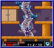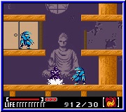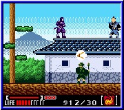 Im Spiel findet ihr unten im Bild Informationen über euern Helden, wie seine Lebensenergie aussieht, welchen Zauber er besitzt und wie oft er einsetzbar ist. Die „lächerlichen" vier Balken links unten zeigt euren Gesundheitszustand. Die Anzeige darüber füllt sich, wenn man den B Button länger drückt um den Bumerang bzw. Wurfstern zu benutzen. Je voller die Leiste um so weiter und kraftvoller fliegt das Gerät. Manch ein besiegter Gegner läßt euch Items liegen, wenn er in die Hölle fährt. Das kann Lebensenergie sein oder auch Ninjazauber. Fünf Sorten dieses Ninjutsu Zaubers findet man, die alle auf die astralen Grundebenen bauen. Diesen wirksamen Zauber sollte man sich für den Endgegner aufsparen, da die restlichen Gegner einen so effektiven Angriff nicht verdient haben.