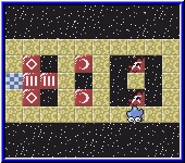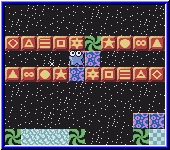 Einfachste Variante ist wenn sich beide gegenüberliegen. Dabei ist es egal in welchem Abstand voneinander. Man betritt eines der Felder und drückt die B-Taste. Nun erscheint ein Klon der transparent dargestellt wird und den Ihr nun auf das 2. Feld des Paares bewegt. Danach drückt man nochmal B und läuft mit dem Original nach irgendeiner Seite und die beiden Steine verschwinden. Soweit so gut. Aber 150 Level wollen gefüllt sein. Dafür haben sich die Programmierer unglaublich viele Hindernisse und knifflige Situationen ausgedacht die bewältigt werden wollen. Zum einen sind die Paare oftmals nicht gegenüber platziert. Möglichkeit ist hier mit gedrückter A-Taste das Feld auf dem der Blob steht zu bewegen um es gegenüber dem anderen zu platzieren. Fallstrick hierbei und bei vielen anderen Varianten ist das Ihr immer ein Feld daneben haben müßt auf das Ihr ausweicht. Verschwinden Steine hinterlassen sie Löcher, die man logischerweise nicht betreten kann. Auch sind viele Spielbretter von Beginn an mit begrenzten Wegen versehen. So muß man oftmals sehr viele Reihenfolgen einhalten um nach und nach die Steine wegzubekommen. Dabei kann es auch sein das Ihr das Startfeld verschieben könnt und so nach und nach über das gesamte Spielfeld flitzen könnt und so an entfernt gelegene Steine gelangt. Aber auch das wäre noch ein wenig zu einfach. Viele andere Items und Hindernisse machen euch das Leben weiter schwer. Z.b. Eiswege wo Ihr nur an den Enden auf andere Felder laufen könnt, Wege die hinter euch verschwinden und damit nur einmal begehbar sind oder Teleporter die euch von einer Ecke zu einer anderen Warpen. Weiterhin sind viele kleine Extras eingebaut. So kann es z.b. sein das sämtliche Steine unbeweglich sind. Hierfür gibt es ein Item, das unter einem Fragezeichenfeld schlummert. Diese Roller Blades erlauben es euch nun alle Steine zu bewegen. Oder der Chili Pfeffer. Mit diesem Extra könnt Ihr euren Blob auch um die Ecke auf ein Paar lenken, was normal nicht geht. Desweiteren kann es sein, das auf dem Spielbrett eine ungerade Anzahl an Steinen vorhanden ist, so das immer eines übrigbleiben würde. Auch hier gibt es ein Item, das z.b. solche Steine eine andere Form annehmen läßt oder mit der Bombe sogar alle verschwinden läßt die dieses Symbol im Stein haben. Habt Ihr also z.b. 5 Sternenfelder reicht es ein paar zu zerstören um alle anderen 3 ebenfalls verschwinden zu lassen. Das man kein Zeitlimit hat paßt hier sehr gut. Denn oftmals spielt man sich regelrecht in eine Sackgasse und merkt erst gegen Ende das man eine falsche Reiheinfolge eingeschlagen hat.