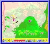 Wie auf dem N64 sind diese Toons in Käfigen eingesperrt. Insgesamt sind 38 Toons im Spiel enthalten. Damit Ihr auch auf dem laufenden seid was euch noch bevorsteht bekommt Ihr am Ende eines Levels immer die beliebte Prozentanzeige zu sehen. Nicht erst seit Donkey Kong ist dies eine enorm motivierende Anzeige. Zu Beginn spielt sich Rayman wie ein gewöhnlicher Jumper. Ihr könnt springen, laufen oder euch an Vorsprüngen festhalten. Im Verlauf des Spiels jedoch erhöhen sich Raymans Fähigkeiten enorm. So kann er mit der Zeit per Propellermove eine Zeit lang in der Luft schweben, sich mit seinen Fäusten in der Luft an Ringen festhalten und so über große Entfernungen schwingen oder per Hilfsmittel hoch und weit springen und somit unerreichbare Orte zu entdecken. Denn ein weiteres sehr motivierendes Feature bietet Rayman. Das Spiel ist nicht linear in dem Sinne. Denn um alle Käfige zu finden und vor allem zu erreichen benötigt Rayman alle Eigenschaften die er im Verlauf des Spiels erlernt. Und so bleiben viele Käfige in den ersten Leveln unerreicht. Erst am Schluß bekommt Rayman die Möglichkeit alle Level nochmals zu besuchen um dann die fehlenden Toons zu befreien. Doch bis dahin ist es ein weiter Weg. Ein weiteres sehr gutes Feature, der Langzeitspielspaß. Rayman gehört zur schwereren Sorte der GBC Jumper. Sind die ersten Welten noch leicht, so werdet Ihr in den hinteren Leveln sehr gut gefordert. Sei es durch ungewöhnliche Geschicklichkeitstests oder auch durch viele kleine Rätsel, vor allem was das finden mancher Käfige angeht. Denn oftmals muß Rayman eine bestimmte Stelle betreten oder ein bestimmtes Item aufnehmen bis ein Käfig sichtbar wird oder eine Plattform.