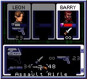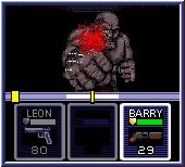 Dazu die bekannten Herbs in verschiedenen Versionen um die Gesundheit zu verbessern oder Vergiftungen zu heilen. Oberhalb sieht man hier die 3 Plätze für die Charaktere, die man ebenfalls hier wechseln kann, sofern man sie gefunden hat. Der zweite Modus ist der eigentlich wichtigere was das Überleben angeht. Denn wie in allen RE Spielen laufen reichlich Zombies durch die Etagen des Schiffes. Schön das man die original Klänge halbwegs ordentlich hinbekommen hat. Das kämpfen gegen sie ist das ungewöhnliche an diesem Game. Sobald Ihr einen oder mehrere in Reichweite eurer Waffe oder eben des Messers habt schaltet der Bildschirm um in den Kampfmodus. Hier habt Ihr nun eure Anzeige für die Waffe und die Lebensleiste. Waffen wechsel ist kein Problem, und oft auch zwingend notwendig. Im oberen Teil sieht man die Gegner. Je nachdem wie weit sie von euch weg sind werden sie hier auch abgebildet. Darunter läuft nun ein Balken hin und her auf einer Skala. Jeder Gegner hat einen Strichbereich auf der Skala. Man muß um den Gegner zu treffen möglichst mittig treffen. So reichen z.b. 2 Schuß mit der Pumpgun auf mittlerer Entfernung. Verfehlt man diesen Strich streift man den Gegner nur und es dauert entsprechend länger. Das ganze spielt so zusammen wie weit die Gegner weg sind, welche Waffe Ihr habt und wie Ihr trefft. Am schwersten mit dem Messer. Dabei spritzt auch Blut, was hier auch hingehört. Natürlich schwer die Figuren grafisch halbwegs Furchteinflößend zu machen. Bedingt gelungen, was aber mehr an der grafischen Möglichkeit des GBC liegt. Der Modus selber ist durchdacht und nicht mal schlecht. Anders auch kaum ordentlich machbar. So ist das Spiel von der Technik her gut gemacht. Spielerisch ist es am Anfang recht zäh zu spielen. Kaum Waffen, Munition und wenig Ahnung was man machen muß. Das gibt sich erst mit der Zeit. Dabei sind es Kleinigkeiten die gelungen sind. Manche Zombies haben Items wie Munition oder Schlüssel bei sich. Bei diesen wird ein kleines Ausrufezeichen angezeigt, so das man weiß um den sollte ich mich kümmern. Auch wenn man Räume betritt und Schränke und sonstiges untersucht erscheint dieses Ausrufezeichen. Auch ob Türen geschlossen oder offen sind wird angezeigt. Dazu kleinere Sequenzen in Form von Standbildern die auch die Geschichte weitererzählen. So findet Barry mit der Zeit auch Lucia und Leon. Ansonsten ist es Adventure typisch. Man braucht hier einen Schlüssel, der 2 Etagen tiefer irgendwo versteckt ist um dann erneut nach anderem zu suchen. Hier wird dem Spieler normale Kost geboten. Sehr positiv ist beim spielen das Speicherfeature. |