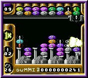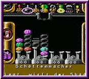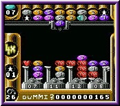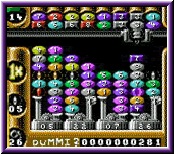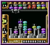 Ist ein zweiter GBC samt Swing angeschlossen kann man sich diese Hilfe auch gleich für das Spiel zu zweit anschauen. Dafür ein großes Lob. Die Options enthalte nur die Soundeinstellungen, sowie die Form und das Aussehen der Kugelsets 1-3, das man seinen Vorlieben anpassen kann. Und Kugelsets in allen möglichen Variationen gibt es zuhauf. Hat man sich hier umgeschaut kann man sich in das Spiel wagen. Ohne große Ablenkung geht es in das Spiel. Wählt man den Einzelspielermodus an gilt es aus drei Schwierigkeitsgraden einen auszuwählen und das Spiel beginnt. Zwei Dinge sind zunächst wichtig zu wissen. Zum einen ist das Hauptziel im Spiel das sammeln von Punkten. Der zweite wichtige Aspekt ist das man ohne Zeitdruck spielt. Den Druck macht man sich hier einzig durch das eigene Spiel. Zu Beginn ist vor dem Spieler der Screen, der in mehrere Teile eingeteilt ist. Der Hauptteil ist der eigentlich Spielscreen mit 8 kleinen Waagen am unteren Ende. Links befinden sich mehrere Anzeigen, die im Verlauf des Spiels wichtig werden. Oben ist der Kugelteil, der aus 2 Reihen untereinander und 8 nebeneinander angeordneten Kugeln besteht. Direkt darunter ist ein beweglicher Korb in dem man diese Kugeln nun aufnimmt. Im Spiel enthalten sind nun sehr viele verschieden Kugel, die sich in ihrer Form und Farbe unterscheiden. Desweiteren haben die Spielkugeln eine Zahl die ihr Gewicht anzeigt. Ziel ist es durch Reihenbildungen und weitere Abhängigkeiten, die Tetris entfernt ähneln Punkte zu sammeln. Mit dem Korb nimmt man aus der untersten Reihe eine Kugel. Drüber rutscht sofort eine weitere nach. Die im Korb befindliche kann man nun auf einer der 8 Aufnahmeplätze fallen lassen. Dabei sind immer 2 dieser Plätze zu einer Art Waage verbunden. Läßt man zu Beginn eine Kugel auf den linken Platz fallen senkt sich dieser und der rechte hebt sich. Durch die verschiedenen Gewichte der Kugeln muß man nun genau abwägen welche Kugel man oben aus den Reihen holt. Das ganze sowohl in der richtigen Farbe wie auch Gewicht. Und genau darin besteht der Reiz und die Schwierigkeit. Um die benötigten Reihen hinzubekommen müssen die nicht verbunden Waagen untereinander so abgestimmt werden das drei gleich Kugeln mindestens nebeneinander liegen. Das große Problem an der Sache ist das immer nach dem nehmen einer Kugel und dem abwerfen eine weitere in den Korb fällt. Selten natürlich die die man braucht.