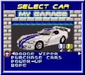Einziger Unterschied sind die vorhandenen Wagen. Wer hat hier wohl von wem geklaut. Oder aber beide benutzten dieselbe Engine und Vorlage. Selbst die Menupunkte sind haargenau die gleichen. Schon ungewöhnlich auf dem GBC Markt. Denn danach erwartet den Spieler das Herz des Spiels, die verschiedenen Cups. Zunächst 6 an der Zahl müssen diese nacheinander gefahren und gewonnen werden. Ziel ist es dabei auf allen Strecken eines Cups immer erster zu werden. Nur so wird man zu, nächsten Cup zugelassen. Ebenso übernommen wurde das Belohnungs und Aufrüstsystem. Je nach erreichtem Platz im Spiel bekommt Ihr neben Geld auch sogenannte Aufrüst Punkte. Höchste Anzahl ist dabei 3 dieser Punkte. Nach einem Rennen könnt Ihr diese nun auf verschiedene Balkenanzeigen für Bodenhaftung, Speed oder Beschleunigung verteilen. Um jedoch einen Balken vollständig zu füllen bedarf es mehrere dieser Punkte. Weiterhin steht es euch frei diese in Turbos zu investieren, wobei ein Punkt für einen Turbo gilt. Allerdings sind diese Turbos wenig von nutzen. Denn im Spiel selber hat man selten gerade Flächen um diese Geschwindigkeitsvorteile auch wirklich ausspielen zu können. Im Spiel selber fahrt Ihr gegen 3 Computergegner, die vor allem in den höheren Cups deutlich besser sind als im Vergleich bei WT 4x4, das ja dieselbe Engine benutzt. Je nach Cup gilt es von 2 über 4 und 6 bis zu 8 Runden gegen die Gegner zu bestehen. Die Strecken sind etwas abwechslungsreicher gestaltet als bei WT 4x4, sind aber nach wie vor etwas hektisch zu fahren. Auch wenn man eine Übersichtskarte mit den Punkten der Wagen zur Verfügung hat. Die Einblendung für eine Kurve links oben im Bildschirm ist von Nachteil, da der Blick selten kontrolliert nach oben geht. Vor allem dann wenn man gerade nach links unten durch Kurven fährt. Die Steuerung ist immer noch leicht hakelig, was aber auch an der Sichtweise auf die Wagen liegt. Man kann dafür recht gut driften, auch wenn es wenig mir Realität zu tun hat wenn man den Wagen nach einer Schanze in der Luft um die Kurve lenken kann. Hier ist also klar der Arcade Aspekt im Vordergrund. Ist aber auch nicht so schlimm. Denn für eine Sim Steuerung bietet sich diese Sichtweise wenig an. Die Wagen sind erkennbar, wobei die Viper durch ihre blauen Streifen natürlich besonders zur Geltung kommt. Positiv fällt auf das Cryo mehr Speed aus der Engine herausgeholt hat. Die Wagen fahren flüssiger, was zwar auch zu Berührungen mit der Begrenzung führt, aber selten Frust hervorruft.