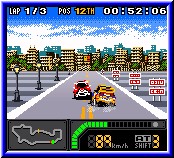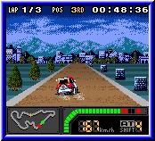 Jetzt kommt ein weiterer sehr motivierender Modus dazu. Ihr besitzt zu Beginn eine bestimmte Anzahl an Punkten, die man im übertragenen Sinne mit Geld vergleichen kann. Davon müßt Ihr euch zunächst erstmal einen Wagen kaufen. Danach ist die Kohle erstmal alle. Nun liegt es an euch diesen Wagen über die 8 Seasons zu verbessern oder einen neuen Wagen zu erstehen. Dazu müßt Ihr euch in den Rennen platzieren. Denn für die Platzierungen, je nachdem welchen Platz Ihr erreicht habt gibt es Punkte dazu. Nun könnt Ihr versuchen durch sparen eine neuen Wagen zu erstehen, oder die in meinen Augen bessere Aufrüstvariante nutzen. Denn jeder Wagen besitzt 4 Balkenanzeigen für Speed, Beschleunigung, Handling und Bremsen. Mit immer höheren Geldbeträgen könnt Ihr dieses Balken schrittweise erhöhen und so den Wagen besser machen. Ich für meinen Teil habe alle 8 Seasons mit einem der ersten Wagen gewonnen. Nur durch das Aufrüsten wohlgemerkt. Ein auch spürbares Feature, das die Motivation hebt. Doch für Punkte sollte man möglichst gewinnen. Auch um weitere Seasons und vor allem Bonusfahrzeuge freizuschalten, wem die erste Variante doch eher liegt. In den Rennen fahrt Ihr gegen 9 Konkurrenten, wobei Ihr immer vom letzten Platz aus startet und in den vor euch liegenden Runden versuchen müßt zu gewinnen. Der Screen ist sehr gut aufgeteilt und übersichtlich. Unten habt Ihr einen Streckenquerschnitt auf dem eurer und der vor euch liegende Wagen als Punkte abgebildet werden. Daneben einen Tacho und die Geschwindigkeitsanzeige, die leider nur Meilen pro Stunde anzeigt. Oben seht Ihr sämtliche Runden und Zeitenanzeigen. Gesteuert wird nach alten Prinzip mit dem Kreuz und A und B. Was nach den ersten Kurven auffällt ist das man das lästige Feature mit der Streckenbegrenzung besser gelöst hat. Kommt Ihr über die Begrenzung hinaus wird der Wage nur langsam und überschlägt sich nicht wie bei allen bisherigen Spielen. Dadurch wir TGR2 leichter spielbar und ist auch für Einsteiger besser spielbar. Vorteil ist das man so besser Überholen kann, obwohl die Aggressive Fahrweise der Gegner aus dem ersten Tel übernommen worden ist. So blockieren wo es nur geht, so das man schon schnell reagieren muß um eine Lücke zu nutzen. Kurven werden wieder je nach Kurvenart mit roten oder gelben Pfeilen dargestellt. Je nach Wagen und Handlingeigenschaften könnt Ihr sie voll nehmen oder durch kurzen vom Gas gehen oder Bremsen. Das Scrolling ist sehr sauber und der Gamespeed recht hoch, ohne aber zu schnell zu sein.