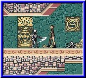 Im Hauptmenu werdet Ihr das erste mal von Lara begrüßt und man bemerkt schon hier ein recht edles grafischen Design. Die Auswahl besteht aus einem Neustart, dem Continue und den Credits. In den Credits könnt Ihr euch in Ruhe das Entwicklerteam anschauen. Der Continue Punkt bringt euch an den letzten gespeicherten Punkt im Spiel. Gespeichert wird über eine interne Batterie. Gewünscht hätte ich mir das es mehrere Speicherslots gegeben hätte. Denn der Umfang sollte zu einigem ausprobieren in den Leveln führen, wo man sich einen Testspielstand gewünscht hätte. Wählt man ein neues Spiel an bekommt man den Vorspann und die Story erzählt. Dabei bekommt man nun die schon angesprochenen Sequenzen zu Gesicht. Laufende Bilder sind es aber nicht. Dafür Standbilder mit Test unterbrochen, die bisher auf dem GBC so wirklich noch nicht zu sehen waren. Das letzte Bild im Test zeigt eines dieser Bilder das aus dem Spiel stammt und kein Artwork oder sowas ist. Vor allem die Fülle dieser Bilder erklärt dann auch warum das Spiel neben MGS ein weiteres 32Mbit Mammutgame ist. Aber die Bilder sollte nicht allein dafür verantwortlich sein. Beginnen wird das Spiel in Moskau, wo Lara einen befreundeten Wissenschaftler - Igor Bowmane trifft. Dieser erzählt Ihr von einer geheimnisvollen Handschrift. Diese Handschrift beschreibt dabei die Legende des Steines des Alptraums. Dieses Heiligtum der Azteken, Mayas und Inkas wurde erschaffen um einen Regenten namens Quaxet zu besiegen. Diese 3 Völker schlossen danach den Geist des Regenten in diesen Stein ein und setzten ihn in einen Obelisken ein und bauten einen Tempel darum.