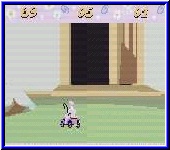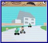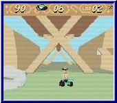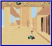 Der Spielscreen hat oben und unten jeweils eine Statusleiste. In der oberen wird links die verbleibende Zeit angezeigt, deine Anzahl an Münzen und die absolvierte Rundenzahl. Unten sehen wir eine Art Tachoverschnitt und die aktuellen Positionsbelegungen. Die aufgenommen Items werden beim überfahren sofort „scharf". Das entsprechende Symbol erscheint dann für die Dauer im rechten Spielbildschirm. Nach jedem erfolgreichen Rennen bekommt man ein Paßwort, deren Symbolbedeutung man sich mit viel Phantasie notieren sollte.