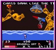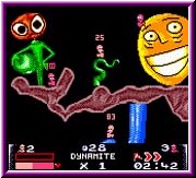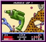 Bewegen tun sich die Würmer mit dem Steuerkreuz links und rechts und jumpen tun sie mit dem A Knopf. Gezielt wird mit dem Steuerkreuz oben und unten. Diese Steuerung bedarf die ersten 10 Min. etwas Übung, wird aber später selbstverständlich. Und da die Action allein noch nicht reicht, haben die Programmierer zur Erheiterung noch dumme Sprüche eingebaut. Ob nun : "Bruno mischt alle auf" oder auch "Gregor riecht den Sieg" sind einige Sprüche vorhanden die zwar der Situation nicht unbedingt entsprechen, aber eben furchtbar lustig sind. Es ist diese Mischung aus Action und Fun, was Worms so besonders macht. Hat man seine Würmer erfolgreich durch die Stage geführt und die Runden gewonnen, spielt man ein neues Scenario frei. Insgesamt acht verschiedene Scenarios finden so den Weg auf unseren GBC. Leider gibt es keine Möglichkeit zu speichern. Damit müssen bei jedem Neustart alle Daten (Namen) neu eingegeben werden. Doch ich glaube damit kann man gut leben, den der Spaßfaktor ist so hoch, das man solche Kleinigkeiten getrost wegsteckt.
