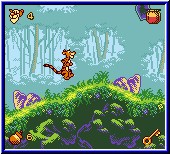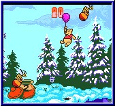 Doch nicht nur Honigtöpfe sind in den Leveln verteilt, sonden auch Extraleben, goldene Eicheln für Unsichtbarkeit und kleine goldene Schlüssel, die euch erst den Weitermarsch ermöglichen. Tigger ist zwar ein geübter Jumper und beherrscht mehrere Sprungvarianten, doch gibt es auch Abschnitte im Spiel, wo selbst der Super Hüpfsprung nicht ausreicht. Da muß man sich dann auf Blättern am Boden stellen und dort ordentlich abfedern, um den oberen Abschnitt zu erreichen. An jedem Levelende warten dann Tiggers Freunde auf ihn und nehmen ihm den Honig ab. Hat man nicht aufgepaßt, kann es passieren, das Ferkel oder Rabbit ihn noch einmal losschicken, weil der Honig nicht reicht. Sprich: ihr habt einen Topf verpaßt. Nach dem zweiten, neunten und sechzehnten Level erhaltet ihr ein Minispiel, wo es darum geht, mit Ferkel auf dem Fluß zu bestehen oder Rabbits Gemüse-Memory zu spielen. Das Minispiel bei der Eule können zwei Mann spielen. Dazu muß der Game Boy aber abwechselnd bedient werden. Nach jedem Waldabschnitt, wird Puuh beauftragt, den gesammelten Honig vor den Bienen zu beschützen. Dazu muß Puuh sich an einen Balon hängen und die anfliegenden Bienen mit Eicheln bewerfen. In der Mitte oben seht ihr, wieviele Bienen noch abgewehrt werden müssen, bevor Tigger weitermachen kann. Denn erst, wenn alle Bienen abgewehrt worden sind, geht das Spiel weiter. Das Spiel ist wieder einmal das richtige für Kiddies. Hübsch anzusehen, leichtes Zurechtfinden und relative Gewaltfreiheit. Sieht man einmal davon ab, das man dem Eichhörnchen auf den Kopf springen kann (nicht muß) oder die Bienen mit Eicheln bewirft. Doch da gibt es ja ganz andere Spiele ...! Durch die zwei Schwierigkeitsgrade können sich die Kleinen langsam steigern und die Herausforderung wächst. Natürlich ist es ein Zielgruppenspiel, das die 6-10 jährigen anspricht. Doch man muß zugeben, das sich grafisch zum Vorgänger einiges getan hat. So ist die Grafik für GBC Spiele sehr gut und detailfreudig. So kommt auch das Auge auf seine Kosten. Akustisch kann man sich auch nicht übermäßig beschweren, denn es gibt schlimmere Ohrenqualen als diese. Die Kinder wird es freuen, wenn der dicke Puuh Bär und sein gestreifter Freund Tigger wieder einmal den Hundert-Morgen-Wald unsicher machen. |