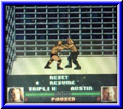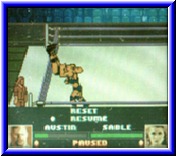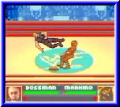 | Bevor man sich in die vielen enthalten Spielmodi stürzt ist ein Training unerläßlich. Auch dieses findet man hier auf dem Hauptbildschirm. Vor den Kämpfen wie beim Training wählt man seinen Kämpfer aus. Ebenso ist es überall möglich einen Zufallsgenerator zu starten. Jetzt wird dem Spieler ein Wrestler zugeteilt. Im Training kann man ebenfalls ein wenig am Schwierigkeitsgrad drehen. So kann man einstellen ob der Gegner passiv dastehen soll oder richtig hart zur Sache gehen soll. Danach geht's auch schon zur Sache. Der Überblick über den Ring ist sehr gut. Die Figuren passen von der Relation sehr gut hinein. Auch die Animationen der Kämpfer und ihre Bewegungen gerade bei verschiedenen Moves sind recht gut gelungen. Und Moves gibt es mehr als genug. Durch die Belegung von 3 Tasten und dem variieren der Richtung mit dem Steuerkreuz kommt man pro Wrestler auf 40 Moves. Diese Moves sind keine Pseudomoves. Von einer einfachen Clothesline, einem Drop Kick, den verschiedenen Varianten des Elbow Drop's bis hin zum Reverse Suplex ist alles vorhanden was die Wrestling Kunst hergiebt. Dabei ist es wie in vielen Wrestling Spielen. Je nachdem ob der Gegner steht oder liegt, oder ob der Angriff von vorn oder von hinten kommt ändert sich der entsprechende Move. Vorteil ist das alle Schlagfolgen im Handbuch erklärt sind. Ebenso sind sämtliche Finishing Moves aller Kämpfer integriert, die man wie fast alle anderen Moves auch erkennt. Auch klappen die meisten Moves relativ schnell. Alle Moves braucht man eigentlich nicht. Für die Finisher ist nun die Select Taste gedacht. Für die Stärke der Kämpfer exestieren unterhalb Energiebalken. Man beginnt mit grün, geht über gelb und orange bis hin zum rot, bei dem man schon Bewußtlos ist. Zwischen diesen Farbbalken kann man den Gegner auch Bewußtlos machen, was folgende Aktionen wesentlich einfacher macht. Super finde ich die Umsetzung der High Flying Action von den Ringseilen. Man steigt hoch, springt und kann im Flug die Richtung beeinflussen. Ist der Gegner schlau geht er aus der Schußrichtung und der Angriff geht nach hinten los. Hat man den Gegner relativ müde gemacht und setzt den Finishing Move z.b. an kann man auch einen Pin versuchen. Dabei läuft die Leiste langsam oder schnell herunter. Jetzt läuft die Uhr bis 3. Ist die Leiste immer noch nicht zu ende wars das und der Sieg ist euer. |