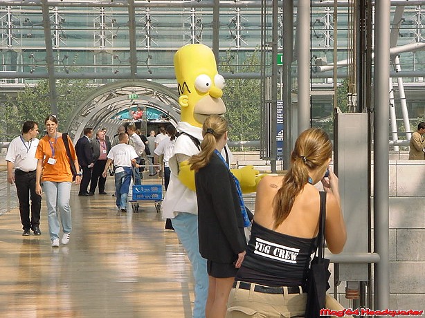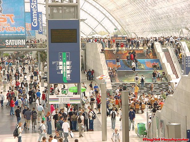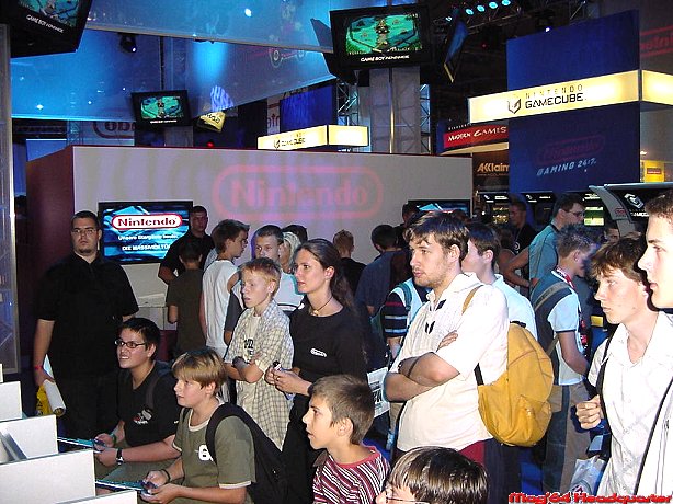 Ebenso kamen erst kurz vor der Messe noch neuere Versionen anderer Titel und boten so manche Überraschung. Denn siehe da. 1080 Avalanche wird in der Final einen kompletten LAN Modus bieten. Auch Banjo Kazooie: Grunty's Revenge für den GBA ist so ein Späteintrudler, war spielbar und stieg gleich mal zu einem meiner Favoriten auf. Das alte Spielprinzip in einer technisch anderen Umsetzung als auf dem N64. Artikel zu den spielbaren Games auf der Messe findet Ihr in den jeweilgen Previews. Schade fand ich in diesem Zusammenhang das man nach der Verschiebung von Final Fantasy CC nur selbstlaufende Demos zeigte. Offizieller Grund ist übrigens einzig die aufwendige Lokalisierung des Titels. Überstürzen möchte man nichts. Also lieber verschieben. Dafür war der vorgezogene Titel Mario Party 5 ebenfalls spielbar und man darf sich wieder auf einen verbesserten Titel gegenüber der 4er Version freuen. Neues zu Metroid Prime und ED2 gibt es nur dahingehend das sie nach wie vor geplant sind. Konkrete Dinge gibt es aber keine. Wer sich übrigens dafür interessiert warum F-Zero keinen LAN Modus bietet wird mit etwas Stirnrunzeln zur Kenntnis nehmen, das einzig Zeitprobleme der Grund dafür waren. Das Spiel selber war eher fertig als der LAN Modus, der in Mario Kart benutzt wird und man eine teilweise Neuentwicklung nicht mehr für sinnvoll gehalten wurde. Weiteres Thema betrifft den Link Modus in Golden Sun 2. Gleich 3 Features wird die dt. Version bieten. Neben den Charaktern könnt Ihr Items und Djinns der alten Version in die neue transferieren. Wobei aber z.b. der Charaktertransfer nicht bedeutet das Ihr diese danach sofort gleich im 2er zur Verfügung hat. Erst ab einem Drittel des Spiels trefft Ihr innerhalb der Story auf die alten Recken und könnt sie nutzen. Bevorzugt sollte das ganze per Linkkabbel von einem GBA zum anderen gehen, wobei auch der GBP genutzt werden kann. Aber auch für Spieler die dies nicht nutzen können gibt es ähnlich wie bei den GBC Zeldas einen Paßwort Modus. Lieblingsthema ist immer wieder Animal Crossing. Endlich gab es mal halbwegs positive Nachrichten. Zwar wurde ein Releasetermin noch nicht genannt. Aber er soll kommen. Wobei sogar Teil 1 noch möglich ist. Wie immer an den normalen Messetagen bestand die meiste Rennerei zwischen den Hallen selber und dem Business Center um die Termine wahrzunehmen. Auch so konnte man immer wieder die Menge an Leuten sehen, die wie schon erwähnt an Donnerstag die Messe besuchten. An allen möglichen Ecken die skurilsten Videospielfiguren verkleidet, die ein schönes Fotomotiv abgaben. Von den zarten jungen Damen, die wie immer in einem zarten Hauch von nichts gekleidet waren rede ich mal nicht. Apropo skuril. |