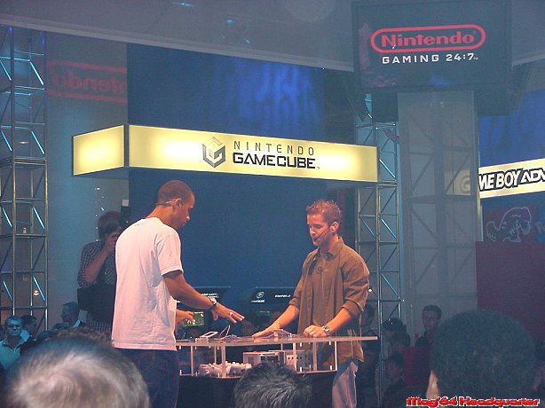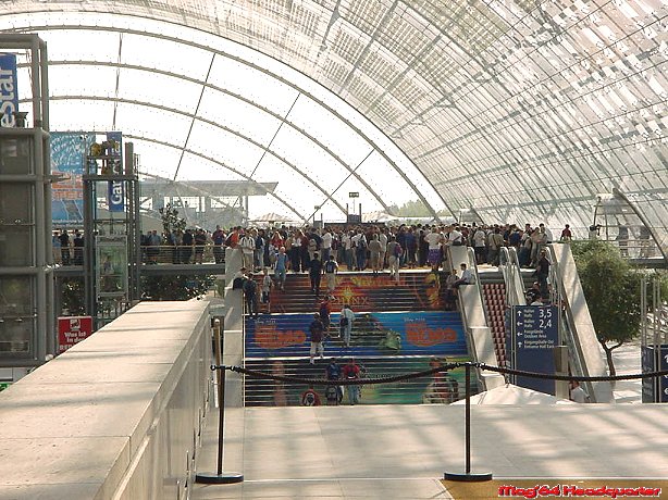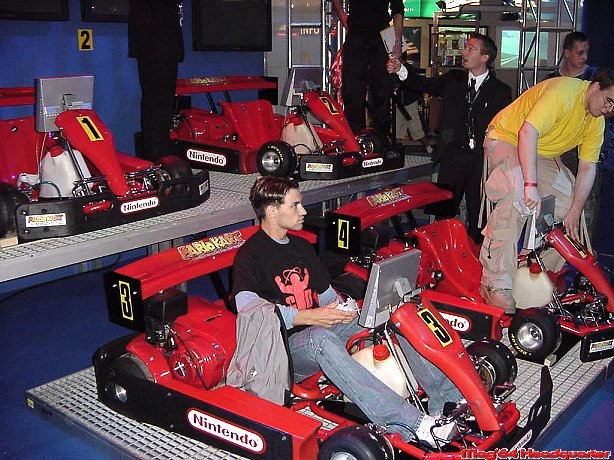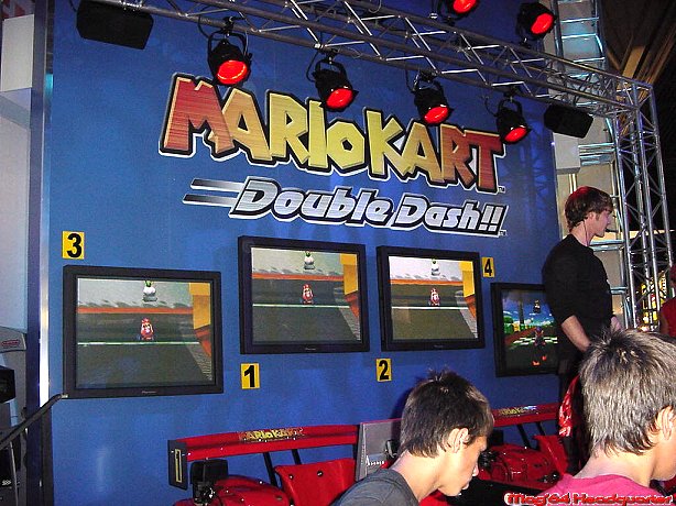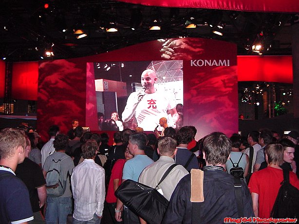 Auch in Sachen Hallen an sich sollte in diesem Jahr mehr auf dem Programm stehen. War Halle 2 im letzten Jahr recht uninteressant durfte man auch diese als Nintendo Interessierter nicht verpassen. Allein Konami mit seinem extremen Yu-Gi-Oh Areal war für Fans der Brett und Videospielumsetzungen ein Eldorado. In diesem Zusammenhang auch immer wieder ein Aspekt in allen Konferenzen. Jeder ist natürlich erfolgreich und der Beste. Man könnte glauben die Branche explodiert. Ja ja, die schönen PR-Reden. ;-) Was ebenfalls wieder vorzüglich funktionierte war die Betreuung der Messe an sich. Für uns als berichtende Medien ist die GC jedesmal eine gelungene Sache. Alles war perfekt organisiert und man fühlte sich was diesen Part anging sehr wohl. Eines kann man nun auf jeden Fall schon sagen. Ausgehend vom Andrang des ersten Besuchertages konnte die Messe eigentlich nur ein Erfolg werden. Dabei in diesem Jahr das geschafft was im letzten Jahr an ein paar Minuten scheiterte. Nämlich kurz vor 10:00Uhr in Halle 3 die entgegenkommenden Massen zu filmen, die den Einlaß stürmen und man fast schon um sein Leben fürchten mußte. ;-) Sehenswerte Szenen, die man so nur selten einfängt. Wobei der erste Tag der Messe auch für uns als Magazin gut beginnen sollte. Mittlerweile hat das Thema auch im Magazin für interessante Reaktionen gesorgt - die Implementierung des Handhelden GP32 im Mag'64. Mit vollem Support wird die Berichterstattung genauso vonstatten gehen wie bei allen anderen Systemen. Wir empfinden das Gerät an sich als recht gelungen und freuen uns über dieses Gerät berichten zu können. Wobei darunter im Magazin nichts leiden wird. Was manche übertiebene Reaktion in meinen Augen auch unverständlich macht. Nachdem die Massen die Hallen geentert haben war es auch für uns erstmal an der Zeit die Locations im fertigen Zustand zu sichten. Und in der Tat haben die Jungs und Mädels von gestern ganze Arbeit geleistet. Alles hergerichtet überboten sich die Firmen wieder mit der Aufmachung der Stände. Vor allem was die Lautstärke angeht bot schon der erste Tag einen Ausblick auf unsere Gehörgänge wie sie wohl am Sonntag noch funktionieren würden. :-) Der Nintendo Stand war im Endeffekt eingeteilt in viele verschiedene Spielstationen seitlich und an den Ecken, sowie einer großen Bühne auf der neben MTV und Giga Moderatoren Gäste wie die Massiven Töne die Stimmung anheizten. Dazu der Mario Kart Stand, der im Verlauf der Messetage eigentlich nie leer war. Zumindest bei diesem Titel dürfte man keinen Zweifel über den Erfolg ab dem 14.November haben. Zur Überraschung vieler zeigte Nintendo in einer berühmt berüchtigten Ab18 Kabine eine spielbare Geist Version. |