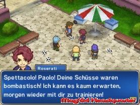 Dabei bietet das Spiel sogar einen Punkt in der Südufer Location, wo man am Bootssteg auf ein Team trifft, bei dem die Elan und Erfahrungspunkte vertauscht wurden. Kleiner Bug in meinen Augen, ist das Verhältnis normalerweise 10 EP und 100 Elan-Punkte. Hier wird das getauscht, was einige Level Ups mit einmal zur Folge hat. Mal ein kleiner Fehler im Code zugunsten des Spielers. ;-) Aber auch so ist gerade das einfache Leveln durch die 4-4 Kicks besser umgesetzt. Man trifft auf mehr Teams, die lange Zeit wirklich schwächer sind als ihr, so dass der Spieler schneller als in den Vorgängern auf höhere Levels kommt und somit das Spiel etwas leichter ist. Spätestens in den 11-11 Spielen gegen starke Mannschaften sind so die bekannten Frustniederlagen wesentlich seltener. Die Wissenschaft und das Tüfteln kommen dennoch nicht zu kurz, setzt hier nur später erst so richtig ein. Verbessert wurde in meinen Augen das Anwerben von Spielern, dass man nicht mehr nur durch Siege schaffen kann, sondern spezielle neue Automaten sind dafür der Grund. 3 verschiedene Münzsorten gibt es jetzt auf dem 3DS, die von einfachen bis zu seltenen Klassespielern alles hervorbringen können. Einziger Nachteil, zumindest wenn man dieses Feature oft nutzt, das die Personalisierung und der Bezug zu den Spielern etwas flöten geht. Man wechselt hier wesentlich öfters sein Stammpersonal durch und ist nie lange auf ein Team festgelegt, dass man dann stetig entwickelt. Neuerungen gibt es aber auch auf dem Platz. Neben den neuen Special Moves, können sich nun auch 2 Spieler verbinden und z.B. Torschüsse noch extremer machen. Speziell wenn die Spieler hintereinander stehen, kann man so den Schuss noch verstärken. Ebenfalls gibt es über neue Buttons weitere Taktikeinflüsse, die man je nach Bedarf einfach ausführen kann.
