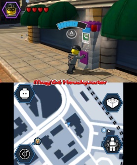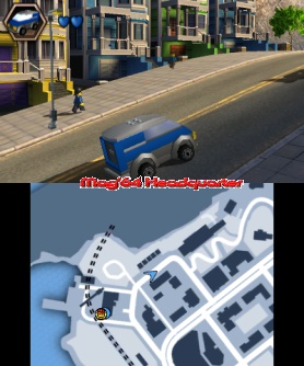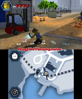 Habt ihr euch für ein Neues Spiel entschieden, beginnt die Geschichte des Spiels mit der Ankunft des neuen Beamten Chase McCain in Lego City. Dabei erwartet euch eine von mehreren gut gemachten Sequenzen, die dann auch komplett vertont sind. Im späteren Verlauf nimmt das leider etwas ab und man präsentiert das Ganze meist mit Untertiteln. Ihr als Spieler landet hier in Lego City, die mit mehreren angrenzenden Gebieten der Spielort sein wird. Dabei bietet Undercover ein wirklich tolles Feature, dass man so nur äußerst selten mal zu sehen bekommt. Nämlich ein Open World Adventure Gameplay, das stark an das Gameplay von GTA oder Driver erinnert. Wobei man hier noch ein komplettes Aufgaben-Gameplay hineingepackt hat, das weit mehr bietet als nur in verschiedenen Autos von A nach B zu fahren. Sprich ihr könnt euch in den teils recht umfangreichen Stadtteilen frei bewegen und dabei in Jump'n Run Manier agieren, oder eben jeden Wagen entern der irgendwo um euch herum düst. Das hat schon was und bringt durchaus frischen Wind in die Serie und auch den 3DS. Anders als auf der Wii U, wo man das gleiche System erleben darf, sind aber nicht alle Stadtteile gleichzeitig und jederzeit begehbar. Hier folgt man stetig dem festen Aufgabensystem und bewegt sich immer eine ganze Weile in einem festen Stadtteil, ehe es dann zum jeweils nächsten geht. Erinnert hier also mehr an Lego Batman oder DC Heroes. Muss aber zunächst einmal nichts schlechtes sein. In Sachen Screenaufteilung geht man auch hier den gewohnten und logischen Weg. Während die reine spielerische Action ausschließlich auf dem 3D-Screen dargestellt wird, dient der Touch Screen für die Kartenansicht und diverse Zusatzbuttons, die im Verlauf des Spiels immer wieder neu dazukommen und dort platziert werden.