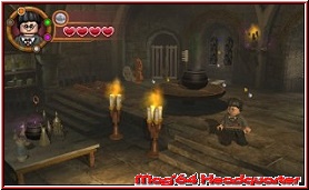 Nicht weiter überraschend ist auch in der Harry Potter Umsetzung die Sichtweise, in der gewohnten Third Person Perspektive, die leicht erhöht über dem Geschehen angebracht ist. Ebenfalls klar, dass sich die eigentliche Action im 3D Screen abspielt, während euch der Touch Screen mit Infos, der Charakter Anzeige, den Zaubersprüchen oder bei Rätseln unterstützt. Ebenso sind viele Aktionen auch über ihn machbar. Wobei man hier wieder sagen muss, man nutzt es kaum. Denn im Spiel wird auch die herkömmliche Kreuz/Tasten Steuerung unterstützt, die viel leichter von der Hand geht. Neben der Spielaction zeigt man euch auf dem 3D Screen weitere wichtige und auch bekannte Dinge an. Neben den 4 Herzen, die eure Lebensenergie darstellen, wird auch hier der gerade aktive Charakter angezeigt und eure erspielten Lego Steine, die ja wieder als Zahlungsmittel in verschiedenen Wertigkeiten enthalten sind. Dazu kommt hier nun Zaubertypisch der gerade gewählte Zauberspruch. Bringt spielerisch auch den größten Unterschied z.B. zu den Star Wars Spielen mit, da viel weniger Gegner an der Tagesordnung sind und viel mehr Rätselaction auf euch wartet. Die Grundsteuerung ist aber auch hier wieder recht einfach und simpel aufgebaut. Gelaufen wird dabei wahlweise mit dem Kreuz oder auch dem Schiebepad, während die B-Taste den Sprung abdeckt. Die A-Taste dient für alle möglichen Interaktionen mit der Umgebung und zeigen euch anhand von Symbolen an, wo etwas zu tätigen ist. Nicht der einzige Punkt der das Spiel so auch wieder etwas leichter macht. Die Y-Taste ist die am häufigsten genutzte Funktion. Sie deckt alle Arten der Zaubersprüche der Charaktere ab und ihr bekommt so die Möglichkeit Zauber auf alles und jeden anzuwenden. Gleichzeitig dienen sie der Abwehr von Angriffen wie z.B. gegen die Dementoren. Etwas mehr als 10 Zaubersprüche gibt es, die vom Stupor, Lumos oder dem oft genutzten Expecto Patronum reichen, aber hier auch solche eher selten eingebaute Varianten bieten, wie den Haustier Zauber, den Umhang oder auch die schwarze Magie, die man aber erst im Verlauf freispielt. Auch hier wieder über spezielle Charaktere. Dank der Unmengen an Charakteren gibt es einmal mehr genug Möglichkeiten.