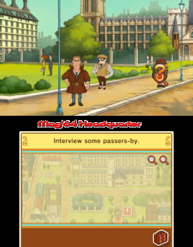 Zu Beginn der Spielhandlung eröffnet Katrielle ein Detektivbüro in der Chancery Lane. Sie will sich damit nicht nur selbst beweisen, sondern hofft auch, im Verlauf ihrer Arbeit Hinweise auf den Verbleib ihres verschollenen Vaters, Professor Layton, zu finden. Auf ihrem Fahrrad rast Katrielle unentwegt durch London und löst einen ungewöhnlichen Fall nach dem anderen. Dabei wird sie mehr und mehr in mysteriöse Ereignisse verwickelt, in deren Verlauf sie ohne es zu ahnen einer Millionärsverschwörung auf die Spur kommt. Zum Glück ist Katrielle nicht ganz auf sich allein gestellt. Ernest Drowrig, ein Student der Gressenheller Universität, heuert in ihrem Detektivbüro als Assistent an. Und schließlich macht Sherl das Spürnasen-Trio komplett. Der sprechende Hund wird zunächst Katrielles erster Klient und später ihr treuer Begleiter. Bevor man loslegen kann, erwartet euch wie immer das bescheidene Hauptmenü. Ihr könnt hier ein Neues Spiel beginnen, ein gespeichertes Fortsetzen, oder in den Optionen die Lautstärke anpassen, sowie die Spotpass Funktion aktivieren. Dazu kommen die Zusatzinhalte, über die man euch sofort in den eShop bringt und zu guter Letzt wartet der neue Bonus Bereich auf euch. Hier findet man einige neue Minispiele, das neue Rätsel des Tages und kann vor allem auch ältere Fälle noch einmal spielen. Alles baut allerdings auf dem Hauptspiel auf, so dass wir uns diesem natürlich etwas intensiver widmen wollen.
