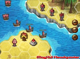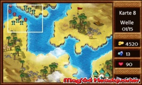 Beginnt ihr den Feldzug-Modus, so wechselt ihr nun natürlich auf die Seite der Verteidiger, während nun die Wikinger versuchen eure Verteidigung zu überrennen. Spielen könnt ihr das Ganze auf 3 Schwierigkeitsgraden, die wirklich alle Vorlieben abdecken. Von Einfach zum Lernen, bis hin zum "…ich muss erst einmal den 3DS in die Ecke legen…" Frustgrad ist hier alles dabei, so dass man mit dem mittleren Grad durchaus am besten fährt. Vor dem Spieler liegen nun 30 Karten auf 3 Welten verteilt, in denen ihr als Spieler die anrückenden Wellen von Wikingern vom Erobern bestimmter Gebäude abhalten müsst. Dabei gibt es spielerisch einige einfache und ganz klare Regeln, auf die hier alles im Spiel aufbaut. Ihr als Spieler seid hier immer die Landratten und müsst durch das Bauen von Türmen für die Verteidigung sorgen, während die Gegner immer auf dem Wasserweg ihre Angriffe starten. So ist es logisch, dass die Karten immer eine Mischung aus verschiedenen großen Landgebieten bieten und den dazwischen laufenden Wasserwegen. Meist Flussbreite, aber auch offene Gewässer, die es natürlich den Verteidigern schwerer machen. Aber auch sonst schaukelt sich die Schwierigkeit im Spiel allein durch die Kartengestaltung auf. Denn die einfachste Variante ist natürlich 1 Fluss, an dessen Ende eure Festung zu sehen ist, während vom anderen Ende aus die Wikinger zum Angriff blasen. Ihr müsst diese nun zerstören und logischerweise auf dem Weg zur Festung stoppen. Weiterer ganz wichtiger Aspekt ist die Tatsache, dass selbst eure Festung und damit das Zielobjekt der Wikinger eine eigene Lebensanzeige von einem Wert 100 besitzt. Brechen also doch einmal Wikinger durch eure Verteidigung durch, ist das noch lange nicht das Ende. Je nach Größe und Wertigkeit der jeweiligen Wikingereinheit verliert ihr Punkte in der Lebensanzeige, könnt aber dennoch die Karte noch gewinnen.