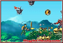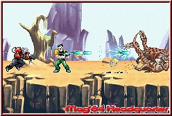 Was dabei sehr gefällt ist die Tatsache das Ihr eure Waffen aufpowern könnt. Wie bei einem Gradius oder anderen Weltraumshootern findet man Goodies die man aufsammeln kann und die aus der einfachen Waffe plötzlich eine Superwumme für eine gewisse Zeit machen. 3fach Geschosse oder zielsuchende Geschosse die euch natürlich ungemein unterstützen. Wie schon gesagt ist vieles einfach nur rennen und ballern ohne aber das es irgendwie langweilig wird. Einzig der anfänglich schwache Schwierigkeitsgrad ist nichts für Hardcore Zocker. Was aber auch an den Rücksetzpunkten liegt, da man fast aller 3 Screens erreicht. Frust sollte also selbst der jüngste Spieler hier kaum erleben. Nach und nach kommen die anderen beiden Helden dazu.