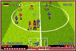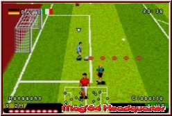 Spielen könnt Ihr das ganze in 3 verschiedenen Kamera Perspektiven. Wobei sich die Standard und TV Variante sehr ähnlich sind. Erst mit der Übersichtskarte wird das Geschehen weiter weg gezoomt. Wie die Fifa Spiele auch bietet Anstoss Action ein Pseudo 3D Gameplay mit einer Sichtweise erhöht von der Seite. In Sachen Einblendungen, die man auch deaktivieren kann, stehen euch Spielstand, Spielzeit und natürlich der Querschnitt des Geschehens zur Verfügung. Ist der Anstoss vollzogen kommt nun natürlich das Gameplay zu seinem Recht. Wie alle Spiele dieser Art unterscheidet man auch hier in Offensiv und Defensiv Steuerung. GBA üblich ist die Steuerung bei weitem nicht so vielschichtig wie z.b. beim DS. Aber selbst im Vergleich zu den Fifa Spielen auf dem GBA gibt es Unterschiede, die aus Anstoss Action ein reines Arcade Fußball Spiel machen. Habt Ihr den Ball könnt Ihr per A-Taste einen Pass spielen, der in der richtigen Richtung geschossen, direkt zu einem Mitspieler geht. Die B-Taste dient für den Schuß, wobei man hier sehr wenig in Sachen Schußstärke variieren kann. Dafür ist das Thema Schlenzen sehr gut gemacht und Flugkurven funktionieren sehr gut. Per L-Taste schaltet Ihr egal ob Defensive oder Offensive zwischen Spielern hin und her und könnt mit der R-Taste einen Sprint hinlegen. Eine Leiste unterhalb der Spieleranzeige zeigt euch die Dauer an, die Ihr noch Rennen könnt. Im gesamten aber nur wenige Sekunden möglich. Auffällig im gesamten Gameplay ist die Tatsache das alles was den Ball angeht sehr fix geht, dagegen das Lauftempo der Spieler eher langsam gehalten wurde. Ein Dribbling anzusetzen, bei denen Ihr nur die Richtung ändern könnt um Gegner auszuschalten ist zu wenig. Man fixiert das ganze sehr schnell auf das reine Pass Spiel, das allerdings gut funktioniert. Auch wenn selbst einfache Pässe fast schon wie Schüsse in Sachen Schnelligkeit zum Mitspieler kommen. Man kann so natürlich das Mittelfeld sehr schnell überbrücken und ist fix vor dem gegnerischen Tor. Danach den Ball ein wenig geschlenzt und der Ball ist so gut wie drin.