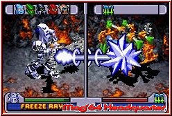 Startet man den Story Modus beginnt alles mit einer für GBA Verhältnisse ellenlagen Sequenz. Zwar kaum animiert gibt es durch viele Standbilder und Texte eine gute Einführung in die Geschichte. Wer mit den Vakama & Co allerdings noch nicht viel am Hut hatte dürfte allerdings Schwierigkeiten haben zu folgen. Denn die Geschichte von Bionicle an sich ist wie bei vielen Serien voller Fachbegriffe und kurioser Eigennamen. Aber es ist ja nicht unser erstes Bionicle Spiel. ;-)) Ist diese lange Sequenz vorbei beginnt das Spiel wenn man so will im ersten Teil des großen, als ganzes gestalteten Labyrinth's. Auch etwas das hier gut gefällt und man eben keine abgeschlossenen Level oder ähnliches spielt. Dabei ist das ganze wie bei einem Pokemon Spiel angelegt. Es gibt 2 Arten des Gameplay's. Einen Adventure Modus, bei dem Ihr von oben per Iso Sicht auf die Umgebungen und eure Helden schaut und als zweites der reine Kampfmodus, der auch grafisch so eingeteilt ist. Da alle 6 Charaktere gleichzeitig für etwas Verwirrung auf dem Screen sorgen würden steuert Ihr sichtbar nur einen, während die anderen imaginär im Rucksack mitlaufen. In der Adventure Sicht habt Ihr nun z.b. die Möglichkeit per L-Taste eine Menu aufzurufen und Live einen der 6 Charaktere zu steuern, während der aktuelle verschwindet. Hintergrund ist der das alle 6 eigene Fähigkeiten verfügen, die sowohl im Kampf wie auch hier im Adventure Teil sinnvoll sind. Beispiel ist Matau, der als Toa der Luft weite Schluchten überqueren kann oder Onewa der Kletterwände nutzen kann.