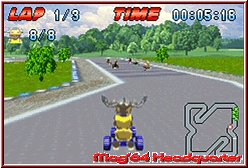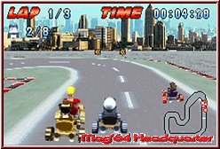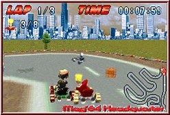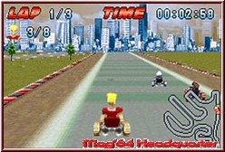 Startet ein Rennen spielt sich alles in der bekannten Sichtweise hinter dem Fahrzeug ab. Auch hier als Karts integriert gilt es nun je 3 Runden zu überstehen und möglichst die Rennen zu gewinnen. Positiv das die Entwickler neben Tacho und Zeitangaben auch eine Karte samt aller Gegner eingeblendet haben. Auch die enthaltenen 7 Gegner in der Anzahl sind zunächst ein Pluspunkt für das Spiel. Ist die Startampel erloschen gilt es fahrerisch zu bestehen. Dabei bietet das Spiel eine sehr simple Steuerung. Neben dem Lenken per Kreuz habt Ihr A und B für Gas und Bremse, die R-Taste um Items zu benutzen, die Mario Kart like auch hier enthalten sind und zu guter letzt bietet die L-Taste eine Drift Funktion. Zumindest laut Handbuch. Denn wie die Bremse ist der Drift so gut wie nicht spürbar oder gar sichtbar. Man braucht eigentlich nur vom Gas zu gehen um eine Kurve zu bekommen und geht danach wieder auf's Gas. Nicht der einzige Kritikpunkt an der recht simplen Steuerung. Die Lenkung ist so angelegt das man vor einer Kurve voll eine Richtung drückt und das Kart ohne zu rutschen einlenkt. Je nach Kurvenradius geht man nur kurz vom Gas oder fährt eben voll um die Kurve. Anspruchsvolle Drifts wie sie ein Mario Kart bietet findet man hier nicht. Simples Einlenken und es geht weiter. Zwar lenkt sich das ganze recht weich, bietet aber kaum die Möglichkeit irgendwie spektakulär zu driften. Problem an der Sache ist außerdem das man dies garnicht müßte. Für mich fast schon der größte Kritikpunkt. Denn die KI der Gegner und der Schwierigkeitsgrad ist alles andere als gelungen. Selbst wenn man das erste mal in der 150er Klasse den Gold Cup fährt hat man keinerlei Probleme zu gewinnen. Denkt man zunächst nicht, weil die Strecken in der 150er Klasse sehr verwinkelt und schwer aussehen. Eigentlich bieten sie auch schöne Streckendesigns, die wenn ein wenig breiter, auch in Mario Kart Spaß machen würden. Allerdings negiert durch den viel zu leichten Schwierigkeitsgrad und der Tatsache das es weder Bergauf und Ab geht, noch Abkürzungen oder ähnliches enthalten sind.