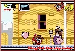 Hier tretet Ihr nun auf den Plan und übernehmt die Rolle von Timmy und seinen Freunden Cosmo und Wanda. Das Hauptmenu begrüßt euch im Stil der Serie und läßt euch die Wahl ein Spiel zu beginnen, per Paßwort ein erreichtes Level weiter zu spielen und in den Optionen nach dem rechten zu sehen, die aber neben Soundeinstellungen keine weiteren Dinge zulassen. Was auffällt ist die Tatsache das im Verlauf des Spiels wie am Anfang so gut wie kein Text enthalten ist. Eigentlich ist das Spiel schon in deutscher Sprache, bietet aber selbst bei Story Sequenzen in Form diverser Standbilder kaum bis garkeinen Text. Schon deshalb sind erstmal außenstehende etwas irritiert worum es eigentlich geht, wenn man nicht gerade das Handbuch zur Hand nimmt.