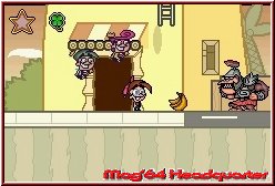 Spielerisch könnte man das Game in mehrere Bereiche einteilen. Grundlage ist schon ein reiner 2D Jumper, bei dem Ihr den guten Timmy steuert. Allerdings schweben gleichzeitig immer euren beiden Freunde um euch herum und können zum einen gesteuert werden oder bieten Dank diverser Specials die Möglichkeit Timmy zu verwandeln um in den Leveln voran zu kommen. Eingeteilt ist das Spiel in 6 Welten, die in sich in viele kleine Räume unterteilt sind, die durch Türen miteinander verbunden sind. Vergleichbar mit einem Kirby geht es so von Raum zu Raum und nicht durch ausladende Level wie man es vielleicht sonst gewöhnt ist. Paßwörter muß sich der Spieler dabei selber holen und nutzt dazu das Paßwort im Pausenmenu. Positiv weil so jeder Raum als Neuanfang zu gebrauchen ist. Dabei ist der erste Raum als Tutorial angelegt und macht euch wie bei einem Wario anhand diverser Wandzeichnungen mit der Steuerung vertraut.