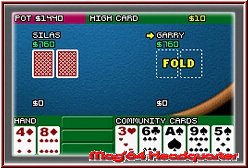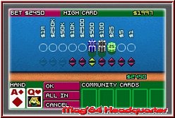 Was euch dabei zur Verfügung steht ist ein kleines Menu, das euch in jeder Runde die entsprechenden Menubefehle zur Verfügung stellt. Seid Ihr der Meinung das es sich für euch lohnen könnt geht man hier zum Setzen Befehl und kann aus seiner eigenen Schatulle mehr setzen. Man klickt sich dabei durch eine Ansammlung von Chips und erhöht so den Einsatz. Danach werden wie schon erwähnt die Züge der Gegner angezeigt und man sieht ob sie mitgehen oder Aussteigen. Am Ende wird wieder auf den gesamten Tisch gezoomt und man gibt mit einer kleinen Sprachausgabe den Gewinner bekannt. Auch hier muß man zweimal hinschauen wer eigentlich gewonnen hat. Hätte man ein wenig auffälliger in Szene setzen können. Das Ziel ist auch hier die 5 Runden zu überstehen, sprich alle 4 Gegner so abzuziehen, das sie Pleite gehend das Weite suchen. Einmal ein wenig eingefuchst in die Präsentation und man kann der Poker Variante auch hier einen gewissen Spielspaß entlocken. Allerdings spürbar meilenweit entfernt von der DS Variante von Texas Hold'em. Die Karriere im Spiel selber ist eine ständige Abfolge an Tischen und neuen Gegnern. Mit zunehmender Spieldauer wird ein immer höherer Einsatz möglich, der sich natürlich auch mit euren Gewinnen steigert. Habt Ihr nur 400 Doller könnt Ihr natürlich keine 500 setzen. Sobald Ihr einen Tisch gewonnen habt bekommt man das Paßwort um den Spielstand auch später fortsetzen zu können. Auf dem GBA kann diese Poker Variante auch Spaß machen. Allerdings getrübt durch die Präsentation und schlechte Übersicht, die vor allem den Langzeitspaß drückt.