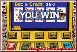 Das zweite Spiel innerhalb des Bundles ist Golden Nugget Casino und bringt euch imaginär nach Las Vegas in das Innere eines Spielcasinos. Was hier bedeutet Ihr könnt mehrere Glücksspiel Varianten zocken. So ist das Hauptmenu hier auch gleich eine Ansammlung der Möglichkeiten in Form von Bildern der Spiele plus den Menupunkten Cashier und Password. Ihr könnt also auch hier jederzeit wenn Ihr irgendwo fett abgeräumt habt ein Paßwort generieren. Allerdings wieder mit knapp 10 Stellen nicht die kleinsten. Der Cashier ist wie der Name schon sagt als Ausgabestelle für Geld zu verstehen. Desweiteren kann man hier seinen Credit einsehen wenn es doch mal um etwas mehr Geld gehen soll. ;-) Der Rest des Menu's sind 4 Bilder die euch die Varianten Blackjack, Table Games, Slot Machines und Video Poker anbieten. Schwächster Teil des ganzen sind in meinen Augen die Slot Machines, die einfach nur eine langweilige Abfolge diverser Automaten bietet. Die einzigen Möglichkeiten die man hat sind das Geld einwerfen und den Hebel bedienen. Der Rest ist stummes zuschauen das sehr schnell sehr langweilig werden kann. Besser ist Video Poker, bei dem man am Automaten 5 Karten bekommt und per Hold Taste wählen kann welche man behalten will und welche nicht. Man kann auch hier Einsätze erhöhen und spielt so nacheinander die Runden bis zum Ergebnis. Hier ist die Übersicht durch feste Maße des Automaten und keinem Bildwechsel ordentlich. Ebenfalls in Ordnung ist die Black Jack Umsetzung, auch wenn die eigenen Karten, sofern man immer eine neue holt nicht immer gleich zu erkennen sind. Gerade Buchstaben der entsprechenden Karten muß man kurz genau beäugen. Wichtigster Teil ist auch hier aber der Roulette Tisch. Immer noch ein Spiel mit dem auch die meisten sofort etwas anfangen können. Hier spürt man allerdings die Restriktionen durch den GBA Screen und die technischen Möglichkeiten mit am stärksten. Das alles eh nicht auf den Screen paßt sieht man sofort.