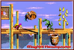 Wie gewohnt bietet auch Donkey Kong Country 3 deutsche Sprache und die üblichen 3 Savegames. Dazu kommt der Multiplayer für das Hauptspiel, der aber wie schon in den Vorgängern nicht unbedingt ein Killer Feature darstellt. Mal wieder neues gibt es dagegen in Sachen Story zu vermelden. In schöner Regelmäßigkeit wechseln im DKC Universum die Hauptdarsteller. Auch im 3er gibt es einen Neuzugang. Hintergrund ist zunächst das wie nach jedem Kampf gegen Schurke K.Rool, DK und Diddy einer entspannten Zeit entgegensehen. So kam es das sich zu den herumhängenden Helden die kleine Dixie gesellte und man zusammen die Zeit verbrachte. Bis sie eines Tages DK und Diddy nicht in ihren Zimmern vorfand. Stattdessen ein Zettel das sie die Insel unsicher machen wollen. Als die beiden nach 3 Tagen nicht zurück waren machte sich Dixie auf den Weg um nach dem rechten zu sehen. Hier beginnt eigentlich auch das Spiel und Ihr macht Bekanntschaft mit dem neuen Charakter. Am Bootsverleih wird Dixie beauftragt auf ihren kindischen Cousin Kiddy aufzupassen. Von nun an zu zweit unterwegs machen sich beide auf die Suche. Wer wohl dahinter steckt? Wieder K.Rool oder doch die neue ominöse Kreatur KAOS....