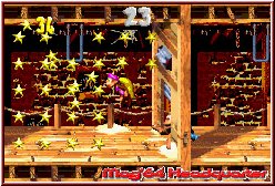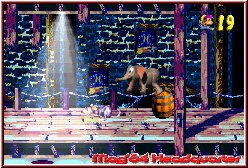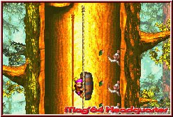 Dabei spielt man auch hier die Level zunächst wieder in einer Reihenfolge, wobei man je nach Abzweigen auch wählen kann wohin mal gehen will. Spezielle Fahnen an gelösten Leveln zeigen euch auch an Wer und Wie ein Level schon gelöst wurde. Doch kommen wir zunächst zum Thema Team und Steuerung, das hier und da schon neues mitbringt. Denn auch Donkey Kong Country 3 ist zunächst mal in der Hauptsache wieder ein normaler 2D Jumper, der aber mit seiner speziellen Grafikdarstellung auch auf dem GBA wieder punkten kann. Beginnt ein Level startet Ihr mit Dixie und alles präsentiert sich auf den ersten Blick wie im Vorgänger. Rechts oben erscheint die Anzahl der Leben, während links oben die gesammelten Bananen angezeigt werden. Wie immer in den DKC Spielen geht Ihr dabei aber nicht allein vor. Denn nach einer kurzen Weile findet Dixie das erste mal Cousin Kiddy in einem Faß versteckt. Jetzt ist es wieder so das Ihr immer einen der beiden steuert. Der andere wuselt allerdings Live mit euch mit bis Ihr wechselt, oder der aktive Charakter draufgeht. Gesteuert werden die Charaktere per Kreuz und können per A-Taste Springen und mit gedrückter B-Taste die berühmte Roll Attacke mit Kiddy ausführen und im Falle von Dixie im Sprung eine gewisse Entferung schweben, was allein schon für mehr Möglichkeiten sorgt, vor allem versteckte Orte in den Leveln zu erreichen. Das sie dazu mit diesem Helicopter Move auch Gegner erledigen kann sollte nicht weiter überraschen. Dazu kommen der Charakterwechsel mit der L-Taste und der sogenannte Team Move. Drückt man die R-Taste springt der gerade zweite Charakter auf euren gesteuerten. Springt man jetzt nach oben und drückt in der Luft B plus eine Richtung kann man den Huckepack Charakter werfen. Nicht nur wichtig um Gegner zu erwischen, sondern ebenfalls um schwer erreichbare Ecken zu erreichen.
