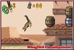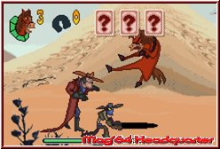 In der uns vorliegenden Testversion (US-Version) waren lediglich zwei Sprachen (Englisch, Französisch) anwählbar, in der deutschen Version soll aber mindestens eine weitere (Deutsch) hinzukommen. Obwohl während des Spielverlaufs eher selten Textkästen auf Eurem Bildschirm erscheinen, trefft Ihr während der Zwischensequenzen wesentlich häufiger auf diese. Um die Story - welche sich nahtlos an den aktuellen Kinofilm anlehnt - besser zu verstehen, solltet Ihr entweder dem Englischen mächtig sein, oder eben einfach zur deutschen Version greifen ;-) . Im Hauptmenü dürft Ihr zum einen unter "New Game" ein neues Spiel starten, im "Password"-Screen per vierstelliger Buchstabenkombination an einem zuvor erfolgreich beendeten Punkt erneut einsteigen, sich die "Options" ("Sound FX", "Music", "Language") zu Gemüte führen oder aber innerhalb der "Credits" die für das Spiel verantwortliche Crew bewundern. Nachdem die Halunken Alameda Slim, Rico und Konsorten aus dem Kittchen geflohen sind, liegt es nun an Euren zwei gestählten Helden, die fünf Banditen wieder hinter Schloss und Riegel zu bringen. Da die Ganoven es auf die glücklichen Kühe - wie Maggie - auf Eurer Weide abgesehen haben, versucht Ihr in der Rolle des Hengstes Buck sowie des Geißbocks Jeb, Eure Freunde vor dem Schlimmsten zu bewahren. Auf Eurer beschwerlichen Reise erhaltet Ihr tatkräftige Unterstützung vom Hoppelhasen Lucky Jack, der Euch Raffinessen innerhalb der Steuerung beibringt.