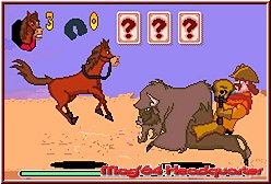 Mit jedem besiegten Gegner steigt Eure Hufeisenanzeige, welche - gefüllt - einen Power-Angriff losbricht, die Euren Feinden den letzten Rest gibt. Die Action-Sequenzen sind in mehrere Zonen aufgeteilt, in welchen Ihr durchweg von einer Horde wilder Angreifer attackiert werdet. Nach einem jeden Abschnitt erscheint der Hase Lucky Jack, der Euch verloren gegangene Lebensenergie in Form eines Sheriffsterns zurück gibt. Extraleben erhaltet Ihr während des Levels ab und an in Trophäenform. Einige Eurer Gegner hinterlassen nach ihrem Ableben weitere Items (Kaffeekanne, Boxer Shorts, Münzsack, Stiefel, Sprengsatz), wobei drei gesammelte Objekte neben Lebensenergie Euch auch weitere nützliche Extras bescheren. Drei Münzsäcke schenken Buck beispielsweise zwei Zusatzleben, drei Sprengsätze reinigen den Bildschirm von allen Übeltätern. Habt Ihr die Zonen einigermaßen unbeschadet überstanden, erwartet Euch einer der insgesamt fünf geflohenen Banditen, welche es gilt, erneut hinter Gitter zu bringen. Zwar bedarf es bei diesen keiner besonders anspruchsvollen Strategie, jedoch solltet Ihr auf deren Angriffe achten, da Ihr andererseits das ein oder andere Leben verlieren könntet. Im Gegensatz zu Buck's Abschnitten sind Jeb's Parts bei weitem gewaltfreier. Hier gilt es in typischer 2D-Jump `n Run-Ansicht durch die Levels zu jagen, um letztendlich auf das Porträt des als nächsten zu fassenden Gauners zu stoßen.