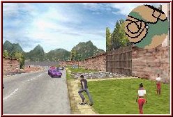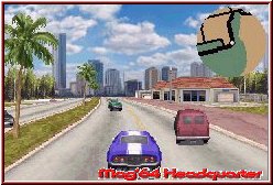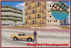 Ihr steht vor eurem Haus in Miami und schaut zunächst auf die Karte. Wohlgemerkt ist man nicht verpflichtet die Mission anzugehen. Man könnte auch einfach nur durch die Gegend brausen, Leute umfahren oder die zahlreichen Nebenmissionen angehen. So aber bietet die Karte verschiedene Symbole für die Haupt und Nebenmissionen. Meist schön weit weg muß man sich also ein Auto schnappen. Knapp 20 verschiedene stehen euch zur Verfügung wenn ich mich nicht verzählt habe und reichen vom Jeep bis hin zum Sportwagen. Man besorgt sich also eine Karre und folgt nun grob dem Pfeil auf dem Radar, wobei man dennoch auf die große Karte schauen sollte um nicht Umwege zu fahren. Die Steuerung der Autos ist simpel und sehr auf Arcade ausgelegt. Neben A und B für Gas und Bremse ist vor allem die R-Taste für die Handbremse immens wichtig. Denn enge Kurven sind normal kaum zu fahren und man slidet förmlich aus der Kurve gegen die nächste Hauswand. Also die Handbremse gezogen und schon kann man den Wagen im Rally Stil um die Ecken schmeißen. Verschiedene Geschwindigkeiten, je nach Fahrzeugtyp braust Ihr durch die Gegend und habt dabei kompletten Verkehr auf den Straßen, der einem manchmal nerven kann. Denn hier ist die Kollisionsabfrage auf der einen Seite zu genau und auch zu extrem. Jeder kleinste Lichtmast läßt euch abrupt stoppen und Crash's mit anderen Verkehrsteilnehmern erzeugt manchmal einen komisch wirkenden Rückstoß. Muß man sich mit der Zeit arrangieren und eben den Umgang mit der Handbremse erlernen. ;-) Kommt Ihr am Missionsziel an wartet eine farblich unterlegte Stellfläche. Entweder um dort den Wagen zu parken, oder um per R-Taste auszusteigen und einen Charakter zu treffen. Auch hier laufen in den Städten normale Zivilisten herum.