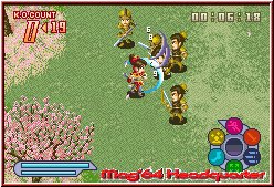 Danach beginnt der eigentliche Kampf und das Gameplay unterscheidet sich nun extrem von den anderen Vertretern dieses Genres. Denn hier landet Ihr in einem mehr oder weniger großen Areal und seht euren Helden wie in einem Adventure aus der Iso Sicht von oben. Ihr bewegt ihn per Steuerkreuz durch die Gegend und kämpft in diesem Spiel in Echtzeit. Jetzt tauchen die Gegner auf, die im gesamten von 20-50 reichen können, aber niemals alle mit einmal kommen. 5-8 stürmen auf euch ein und sind diese besiegt, kommen die nächsten auf euch zu. Jetzt kommen zunächst die Attacken zu ihrem Recht. Ihr selber habt per B und A Taste die Möglichkeit leichte und schnelle Attacken auszuführen oder schwere Varianten, die aber einen Tick länger dauern. Mit dem Schwert wirkt das ganze zunächst wie eine wilde Schlitzerei ohne viel Sinn und Verstand. Teilweise ist es auch nur ein reines Gemetzel. Schließlich will man den Gegner ja Besiegen. Oben links taucht nun ein Counter auf, der alle Gegner auflistet und daneben darstellt wieviele Ihr nun schon besiegt habt. Rechts oben läuft eine Zeitanzeige in verschiedenen Farben mit. Ihr habt zunächst schon unendlich Zeit für den Kampf, könnt aber in 3 Stufen gewinnen. Triumph, Sieg und Knapp. Gelingt es euch schnell zu siegen und einen Triumph zu landen bekommt Ihr z.b. den angesprochenen Extra Zug. Unten rechts wiederum tauchen verschiedene Kreisanzeigen auf. Diese stellen eure persönlichen Eigenschaften dar und sorgen für Verbesserungen im Kampf. Z.b. steht ein Kreis für euren Mut und den Einsatz der Waffe. Wenn Ihr also besonders Draufgängerisch seid und Gegner schnell und ohne Gegentreffer wegrasiert füllt sich diese Anzeige z.b. und Ihr dürft im Kampf Bonuspunkte nutzen. Einfach gesagt steigt so eure Schwertkraft. Diese Anzeigen gibt es für alles mögliche und sind nicht unwichtig. Nachvollziehbar auch dadurch das Treffer bei Gegnern eine Zahl hervorbringen, die anzeigt wieviel Ihr diesem abgezogen habt.