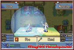 Das Einsatzgebiet Eurer Recken ist äußerst vielseitig, die Möglichkeiten, die Ihr während des Spielerzugs habt, sind ungemein abwechslungsreich. Logisch, dass beinahe jeder Eurer Kameraden das Gegenüber attackieren kann. Wobei jedoch nicht jeder Waffentyp (Lanzen, Äxte, Schwerter) von jedem Charakter geführt werden darf. Das so genannte "Waffen-Dreieck" besagt, dass Schwerter gegenüber Äxten im Vorteil, diese wiederum Lanzen im Kampf überlegen sind. Hingegen übertrumpfen Lanzen Schwerter. Ähnlich verhält es sich beim Einsatz von Magie ("Die Dreieinigkeit der Magie"): Licht-Magie ist beispielsweise stark gegen dunkle Magie, die wiederum Anima überlegen ist. Letztere ist gegenüber der Licht-Magie im Vorteil. Dieser Tatsache zu Folge gestalten sich die Auseinandersetzungen sehr taktisch, teilweise entscheiden Kleinigkeiten über den Ausgang eines Kampfes. Ihr solltet also von vorneherein gut abwägen, welcher Krieger sich im Kampf gegen Feind XY am besten eignet, um erfolgreich als Sieger hervor zu gehen. Auch Schusswaffen wie Bögen finden in "Fire Emblem - The Sacred Stones" Verwendung. Ebenso können sich Kämpfer mit Wurfbeilen aus der Entfernung zur Wehr setzen. Jene Fernwaffen erlauben sogar den Angriff über mehrere Felder hinweg, Schwerter beispielsweise treffen nur Charaktere, die Eurer spielbaren Einheit direkt gegenüber stehen. Ein Raster, welches Ihr auf das Spielfeld projizieren könnt, zeigt Euch die Angriffs- (rot) sowie die Bewegungsreichweite (blau) der Armeen.