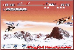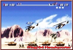 Dabei beginnt das Spiel in der einfachsten Form. Aus beiden Stützpunkten fahren automatisch von der CPU generierte Panzer, gepanzerte Fahrzeuge und Infantrie setzt sich in Marsch. Treffen diese auf der Strecke aufeinander beschießen sie sich und der stärkere kommt so weiter voran. Soweit die einfache Grundlage der CPU Steuerung. Ihr als Spieler habt nun zunächst abwechselnd die Möglichkeit einen Helicopter oder einen Jagdbomber zu steuern. Hier gibt es ein wenig Kritik für die Auswahl. Was den Helicopter angeht so geht das mit heutigen Vorstellungen schon konform. Der Jagdbomber wirkt eher wie eine alte Mustang aus dem Zweiten Weltkrieg. Zeitlich sind beide Vehicle also recht weit auseinander. Diese beiden sind eurer Instrument und ich erkläre das ganze erstmal anhand der Helicopter Mission am Anfang. Während wiegesagt eure Bodentruppen selbsstätig von rechts nach links loslegen beginnt Ihr am Landeplatz. Per Kreuz bewegt Ihr euren Heli in die Lüfte und nach links und rechts. Drückt man eine Seite neigt sich die Nase des Heli nach vorn und Ihr könnt nun wahlweise mit der A-Taste das unendlich vorhandene MG benutzen oder 8 Raketen per B-Taste abfeuern. Diese sind auch Panzerbrechend, da euer Gegner ja alles andere als dumm ist und natürlich ebenfalls Truppen in Bewegung setzt. Einfaches Ziel ist ihn so am vorankommen zu hindern, den Weg freizuschießen, so das eure Truppen auf wenig bis keinen Wiederstand stoßen und der gegnerischen Basis immer näher kommen. Soweit wieder die einfache Theorie.