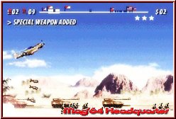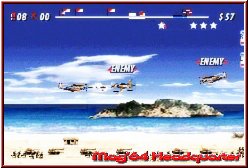 Auch der Gegner besitzt Luftstreitkräfte und versucht mit denen nun ebenfalls eure Bodentruppen zu attackieren. Muß man sich um Sprit keine Sorgen machen gibt es natürlich eine "Lebensleiste" die bei einem Treffer als Balken angezeigt wird. Ist die leer stürzt Ihr ab und verliert eines von anfänglich 3 Leben. Auf Expert ist es übrigens nur 1. ;-) Allerdings kann man durch Abschüsse gegnerischer Fluggeräte Bonus Leben erspielen. Das Problem an der Sache ist zum einen das diese Situationen natürlich nicht vorhersehbar sind und zum anderen Ihr um Raketen nachzufassen zur Basis zurückfliegen müßt um dort zu Landen. Je weiter nun z.b. eure Bodentruppen weg sind um so länger dauert jedesmal der Flug bis zur Frontlinie um zu helfen. Ebenso dient der Rückflug und die Landung um die Energieleiste und damit Panzerung wieder zu repairieren. Soweit der erste praktische Eindruck. Taktik spielt auch hier eine ganz wichtige Rolle, auch wenn man dies anfangs nicht annimmt. Gutes Beispiel sind auf der Strecke immer wieder vorhanden kleine Bunker. Nimmt man diese Bunker ein erscheint zum einen eure Flagge auf diesem und zum anderen generiert dieser nun wie die Hauptbasis auch Geld. Unaufhörlich in einzelnen Schritten bis 99. Rechts oben findet man auch dazu eine Anzeige. Im Umkehrschluß bedeutet das nun das je mehr Bunker Ihr einnehmt auf dem Weg zum Gegner, Ihr auch mehr verdient. Die CPU dankt es euch und schickt so automatisch mehr Bodentruppen auf den Weg, die so einfach gesagt bezahlt werden. Es gibt da keine Begrenzung. Auch dies versucht der Gegner und so entbrennt mit der Zeit ein Kampf um jeden Bunker.