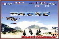 Die Krönung des ganzen ist dann das letzte Drittel im Spiel. Hier übernehmt Ihr dann alles. Das heißt nichts anderes als das Ihr selber auch die Bodentruppen bauen laßt. Wohlgemerkt nicht steuert. Aber Ihr könnt am Boden im Heli Modus ein Baumenu aufrufen und neben fahrbarer Flak, Infantrie auch 2 Panzer Varianten bauen. Alles kostet unterschiedlich und der Kreis schließt sich bei den Finanzen. Hier heißt es nicht nur auf die Steuerung eures Fluggerätes zu achten, sondern auch die Truppenbildung im Auge zu behalten. Nichts ärgert mehr wenn man zwar alles vom Himmel holt aber vergißt im richtigen Moment Bodentruppen auf den Weg zu schicken und so dem Gegner wichtiges Terrain überläßt. Durch die Belohnungen in Form von Bonusleben oder bei effektiver Zielgenauigkeit neue Spezialwaffen zu bekommen macht jede Mission gleich viel Spaß, auch wenn die hinteren Missionen mit dem Baumenu schon über allem thronen. Auch weil nichts begrenzt ist. Habt Ihr genug Geld könnt Ihr bauen soviel Ihr wollt. Egal ob da nun 20 Panzer hintereinander her fahren. Aber die Mischung machts. Schickt man hier noch ein paar fahrbare Flakeinheiten mit so kann der Gegner kein Tontaubenschießen veranstalten. Alles hat einen taktischen Hintergrund und nur das Gesetz des stärkeren zieht nicht. Nach jeder Mission bekommt man dann den Code dazu und kann später mit der nächsten Mission weiter machen oder im Mission Modus auch einzeln diese spielen. Wer es dann schafft das komplette Spiel zu knacken bekommt die sogenannte Modern War Variante. Dann haut auch alles hin und Ihr bekommt neben Apache Heli's auch effektive Jagdflieger heutiger Zeit. Hier ist dann alles schneller und macht vor allem die Jet Landungen noch etwas schwieriger.