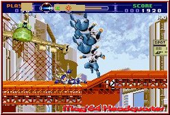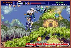 Gunstar Future Heroes ist meist ähnlich einem AstroBoy angelegt das Ihr per einfacher Jump'n Run Manier durch die Gegend lauft und dabei die Waffen in ununterbrochener Abfolge sprechen läßt. Wobei das Thema Abwechslung hier auch eine große Rolle spielt. Neben diesen Einlagen dürft Ihr euch zudem auf Pseudo 3D Flugeinlagen freuen, Zwischen und Endgegnerkämpfe sowie weiterem ungewöhnlichen Varianten im Vorankommen in einem Level. Doch kümmern wir uns zuerst um die meistvertretene Variante. Hier steuert Ihr einfach den Charakter per Kreuz in 2D Scroll Umgebungen nach allen Seiten. Ihr könnt per A-Taste springen und benutzt die B-Taste für die Waffen. Hier kommen nun die Bildschirmanzeigen in's Spiel, die auch für alle anderen Gameplay Varianten gelten. Oben links findet man als erstes in Zahlenanzeige die eigene Lebensenergie. Daneben folgen 3 Symbole, zwischen denen man im Spiel hin und herschalten kann und die einfach gesagt die Art der Waffe definieren. Daneben folgt eine Leiste, die sich füllt sobald Ihr den Gegnern im Screen zeigt was eine Harke ist. Ist diese Leiste komplett gefüllt steigt die Leistung der Waffen, was man nicht nur visuell merkt. Rechts findet man zudem eine Score Anzeige, die auch in diesem Spiel einen besonderen Motivationskick gibt. Die drei Waffensymbole geben wenn man es einfach ausdrücken will ein Dauerfeuer in Form eines Flammenwerfers wieder, die Möglichkeit Einzelgeschosse zu verschießen und im Falle des grünen Symbols zielsuchende Laserattacken zu starten. Dabei ist Gunstar wieder so ein typisches Spiel wo man fast nur mit gedrückter Attack Taste durch die Gegend rennt.