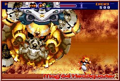 Eine Schwierigkeit im Spiel ist nun die Tatsache das Gegner immer wieder neu generiert werden. Bestimmte Abschnitte eines Levels müssen zwar feindfrei gemacht werden, ehe ein Pfeil das weitergehen anzeigt. Geht man aber nicht weiter tauchen immer neue Möchtegerns auf. Gegner hinterlassen je nach Stärke Heilitems die man aufsammeln kann. Etwas ungewöhnlich gemacht läuft man nicht einfach drüber, sondern muß jedesmal das Kreuz unten plus Action Taste benutzen. Ärgerlich das diese nach ein paar Sekunden wieder verschwinden. Kommt man also nicht gleich ran verschenkt man so immer wieder Lebensenergie. Aufsammeln hätte es in meinen Augen da auch getan. Klasse finde ich das alle Gegnertypen eine Anzeige auf den Screen zaubern wieviel Lebensenergie sie noch haben. Vor allem bei Boss und Zwischengegnern nicht zu unterschätzen, ob man für eine finale Attacke das Risiko mal kurz erhöhen kann. Natürlich könnt Ihr zum einen im Sprung ballern, als auch nach allen Richtungen. Was auch so sein muß. Denn nur Gegner von den Seiten wäre ja fast schon zu einfach. ;-) Wie in einem Uhrwerk greift hier nun eins in das das andere. Zum ersten ist die Steuerung butterweich und ideal für ein solches Spiel. Zudem sind die Attacken nicht nur visuell imposant, sondern man geht als Spieler dabei regelrecht mit, wobei wir wieder bei der penetrant gedrückten Attack Taste sind. Nachteil bei allem das Ihr bei leerer Energieleiste nicht mittendrin abgesetzt werdet, sondern das Level von vorn beginnt. Man merkt auch hier das man ein Spiel im alten Arcade Stil vor sich hat. Allerdings und das entschärft das ganze extrem spielt man sofort wieder ohne Nachzudenken ohne die Lust zu verlieren. Diesen Effekt hat man in jedem Abschnitt des Spiels und ist fast schon das größte Plus. Man merkt ja als Spieler schnell ob man die Lust verliert oder sich sofort wieder hineinstürzen will.