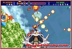Dieser Kick liegt aber auch an anderen Dingen. Zum einen an den Variationen im Gameplay selber. Wie schon angesprochen sind die Laufabschnitte nicht das einzige. Im Verlauf stürzt Ihr euch auch in fliegende Vehicle und die Action geht nun in Pseudo 3D Umgebungen vonstattet. Dabei fliegt Ihr sichtbar im Screen auf euch selber zu, während von allen Seiten immer wieder neue Gegner auftauchen. Erinnert ein wenig an Ikaruga, auch wenn die Sicht eine andere war. Nie zu lange machen auch diese Abschnitte sehr viel Spaß. Dazu wird gemischt, so das Ihr die einzelnen Varianten auch innerhalb einer Location erleben könnt. Weiterhin werden wie schon angesprochen die Level immer größer und damit die Action vielfältiger. Es wird mehr verzweigt und Gegner hängen und kleben an den unmöglichsten Ecken um euch herum. Das Ihr wie ein Mega Man dabei an Wänden hochspringen könnt und müßt unterstreicht das ganze. Und wem das noch nicht reicht darf sich im letzten, fast schon nicht enden wollenden Level an einem Mario Party Verschnitt erfreuen. Hier wechselt teilweise die Sicht auf ein Art Spielbrett, wo der Spieler über eine Würfelanzeige vorankommen muß. Verschiedene Felder, die wahlweise Energie bieten oder man sofort in ein Zwischengegnerlevel gebeamt wird. Wer hier Pech hat und ich spreche da aus eigener Erfahrung, kann zwar mit voller Energie am Brett ankommen, am Ende aber mit fast nichts das ganze verlassen. Ihr seid hier also selber eures Glückes Schmied. ;-) Und immer wenn man denkt "hier bin ich aber gut durchgekommen", darf man sich auf wunderbare Boss Gegner freuen.