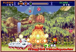 Das Thema Grafik muß man in diesem Spiel fest mit der Plattform und der Engine verbinden. Zeigte ein AstroBoy schon grafisch was der GBA doch so alles drauf hat, schraubt Gunstar dies nochmal einen Tick nach oben. Eine saubere Engine, die Explosions und Waffeneffekte auf den Screen zaubert die man dem GBA eigentlich fast schon nicht zutraut. Satte Farbpower, viele Details und alles mögliche an Animationen sorgen für eine durchgehende Augenweide im Spiel. In diesem Genre das beste was der GBA hergibt. Der Kreis schließt sich beim Sound. Actiongeladene Sounduntermalung sei es bei der Hintergrundmusik oder den satt klingenden Effekten, was einfach gefällt und paßt.