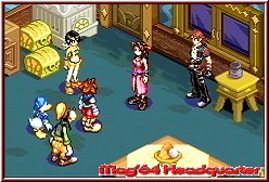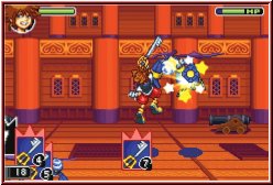 Mittlerweile Standard bei solchen Titeln ist die deutsche Sprache und der Batterie Speicher im Spiel, den man auch hier bietet. Dazu bietet Kingdom Hearts für GBA Verhältnisse einen atemberaubenden Vorspann, der in vieler Hinsicht eher an eine DS Version erinnert. Ein 3D Vorspann, der zwar nicht unbedingt durch Farbpower glänzt, dafür aber vor allem recht lang ist und den Spieler in die Story einweiht und die Verbindung Disney und Square Enix schnell deutlich macht. Eine interessante Story, die anfangs aber auch ein wenig verwirren kann wie alles im Spiel eigentlich zusammenhängt. Einfach gesagt übernehmt Ihr hier die Rolle des 14jährigen Jungen Sora, der begleitet durch die Disney Charaktere Donald und Goofy von nun an durch das Spiel fegt. Nicht von Anfang an zusammen finden die 3 zusammen als sie sich jeweils auf der Suche nach vermißten Personen befanden. Während Sora nach seinen Freunden Riku und Kairi sucht versuchen Donald und Goofy den verschwundenen König ausfindig zu machen. Am Ende dieser Reise durch fremde Welten finden sie zumindest den König und Riku. Doch die Reise ist noch lange nicht zu Ende, im Gegenteil sie fängt eigentlich erst an. Nach dem Einsatz seines Schlüsselschwertes um die Dunkelheit zu verschließen müssen sie ihre Freunde in dieser Welt zurücklassen und machen sich nun auf die Suche nach der Tür die in das Licht führt. Also ziehen die 3 Helden erneut los und treffen nach einiger Zeit einen mysteriösen Charakter, der den dreien ein paar vielsagende Worte entgegnet. "Vor die liegt etwas das du brauchst - doch um es zu erlangen, mußt du etwas wichtiges verlieren". Der Charakter verschwindet wieder und die 3 Helden sehen sich einem einzigen Weg gegenüber, der in das sogenannte Schloß des Entfallens führt. Anfangs wirklich eine Story die viele Fragen aufwirft und wenige Antworten gibt. Hier steigt Ihr als Spieler nun ein und durchquert dieses Schloß, das mit einigen Überraschungen aufwartet.