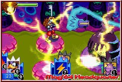 Zum ersten gibt es diese Raum wie auch die Kampfkarten in sogenannten Wertigkeiten von 1-9. Was hier z.b. bedeutet das es im Verlauf des Spiels auch Türen gibt die euch zwar keinen Zwang auferlegen welche Raumkarte Ihr einsetzt, dafür aber welche Wertigkeit diese haben muß. Habt Ihr z.b. eine Speicher Raumkarte mit der Wertigkeit 5 und die Abfrage erfordert 6 oder höher könnt Ihr diese Karte nicht einsetzen. Das ganze geht dann auch noch farblich und das System wird mit zunehmender Zeit intensiver und tiefgehender. Nun ist das Spiel ja ein RPG und wie es nunmal so ist muß man das Level des Helden irgendwie pushen können. Also wird natürlich gekämpft. Auch dafür gibt es Raumkarten. Ebenfalls in den unterschiedlichsten Varianten könnt Ihr so Räume generieren in denen starke Gegner warten, schwache oder solche die keinen sogenannten Erstschlag ausüben können. Habt Ihr also einen Gegnerraum erschaffen betretet Ihr ihn und seht schnell umherwuselnde Gegner. Im Adventure Modus könnt Ihr nun per A-Taste das Schlüsselschwert benutzen um Kisten zu zerschlagen oder eben auf einen solchen umherlaufenden Gegner zu schlagen. Das gilt dann als Erstschlag wie bei einem Paper Mario und Ihr bekommt einen kleinen Kampfvorteil. Allerdings nicht so gewichtig wie man denkt und die Überraschung schlechthin ist die Art der Kämpfe - nämlich in Echtzeit. In einer 2D Sicht auf das Geschehen warten nun meist 4-8 Gegner auf euch deren Ziel es ist eure links oben sichtbare Energieleiste zu drücken. Das ganze spielt sich in der Tat ähnlich einem Tales of Symphonia. Hier greift nun das Kampfsystem, das ebenfalls auf Karten basiert und nach diversen Card Battle Games wieder neue Ansätze auf die Spieler losläßt. Man hat in den Kämpfen an Aktionen zunächst eigentlich nur einen Sprung per B-Taste, das Bewegen nach links, rechts sowie in die Tiefe des Screens und halt dem Schlagen mit dem Schlüsselschwert per A-Taste.