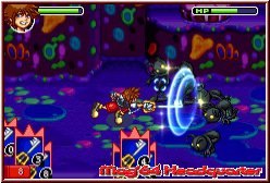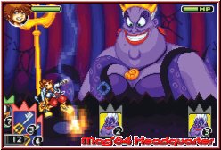 Wer denkt das Spiel sei nun ein Haudrauf Spiel durch das Schwert allein der irrt erneut und es gilt sich wieder umzugewöhnen. Die Decks die euch zur Verfügung stehen können jeweils 99 Karten beinhalten, die Ihr im Kampf einsetzen könnt. Allerdings dauert es lange ehe man 99 Karten dabei hat. Vergleichbar mit dem Baten Kaitos System gibt es reine Angriffskarten, sowie unterstützende Karten, Healer oder Zustandskarten die man einsetzen kann. Links unten im Kampfscreen sind diese Karten nun in einer Kreisanzeige untergebracht. Auch hier sollen ein paar Beispiele die Umsetzung verdeutlichen. Nehmen wir eine einfache Angriffskarte, die auch hier alle verschiedene Wertigkeiten von 1-9 haben. Per L und R-Taste könnt Ihr nun durch die Kreisanzeige der Karten scrollen. So erscheint z.b. eine Schwertkarte mit der Wertigkeit 5. Steht man nun vor einem Gegner drückt man die A-Taste und Sora schlägt auf den Gegner ein und verbraucht dabei diese Karte. Der Gegner wiederum versucht penetrant das gleiche. Greift er euch dabei mit einer Karte an welche die Wertigkeit 4 besitzt ist diese schwächer als eure und Ihr setzt einen Treffer, den sogenannten Kartenstich. Dieser Begriff wird auch eingeblendet und das einzige was man nun sieht ist die Lebensleiste des Gegners. Keine Zahlen oder ähnliches zieht in diesem Spiel also das Gesetz des stärkeren. Gleichlaufend ist so z.b. das Aufleven von Sora mit einem völlig anderen Hintergrund versehen. Wie in vielen RPG's bekommt Ihr für jeden besiegten Gegner EP und bei bestimmten EP Grenzen geht es eine Stufe nach oben. Wie in Paper Mario dürft Ihr nun selber wählen was Ihr entwickeln wollt. Wahlweise die eigene Lebensleiste, die möglichen Kartenpunkte sowie sogenannte Specials die man in den Kämpfen einsetzen kann. So könnte Sora Level 30 haben und dennoch nicht stärker sein als am Anfang wenn man z.b. nur die Lebenspunkte entwickelt.